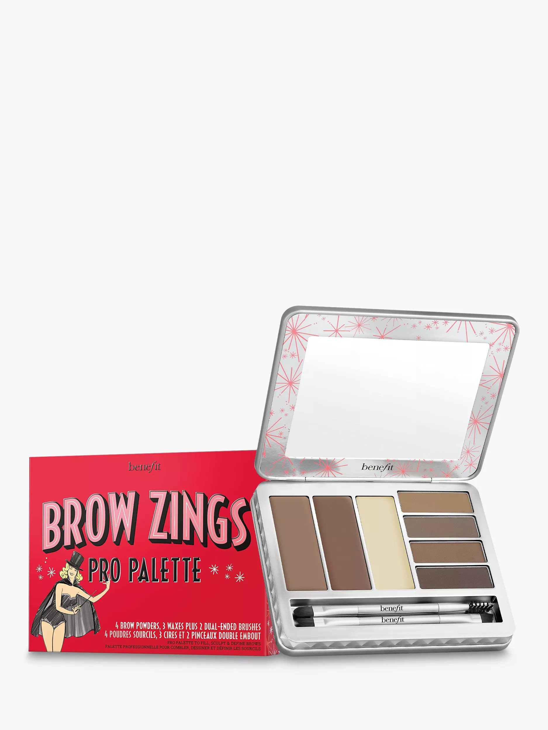 Take your brow look up a notch with Brow Zings Pro Palette! This slim, portable brow palette includes 4 long-wearing brow powders to fill and shape brows and 3 waxes to sculpt and define brows – 2 flattering high-pigment waxes and 1 clear wax.