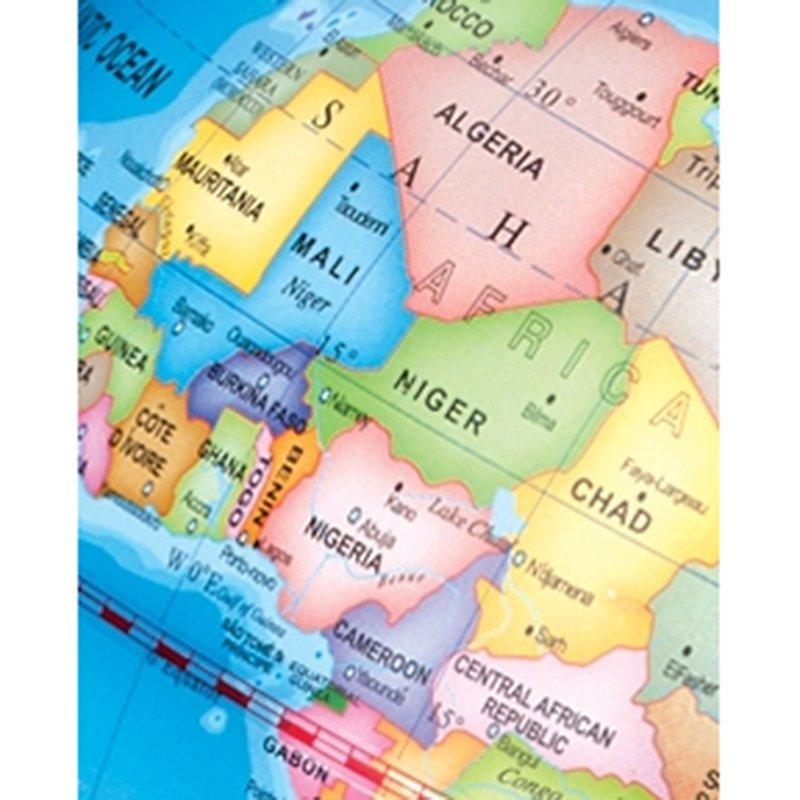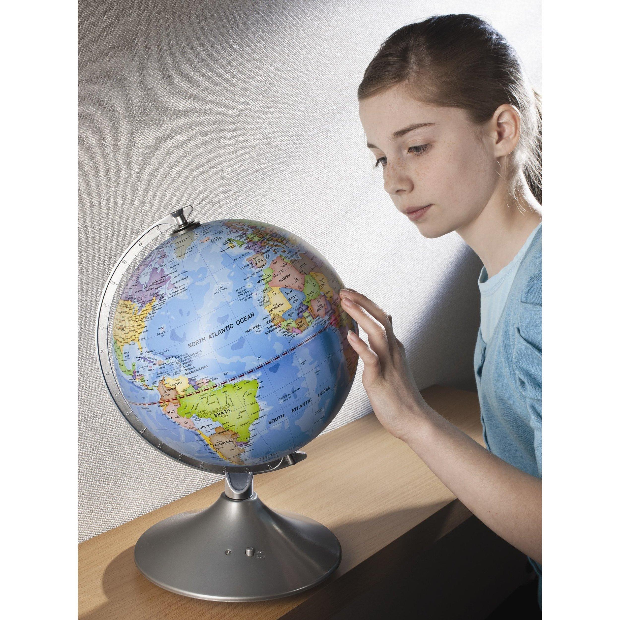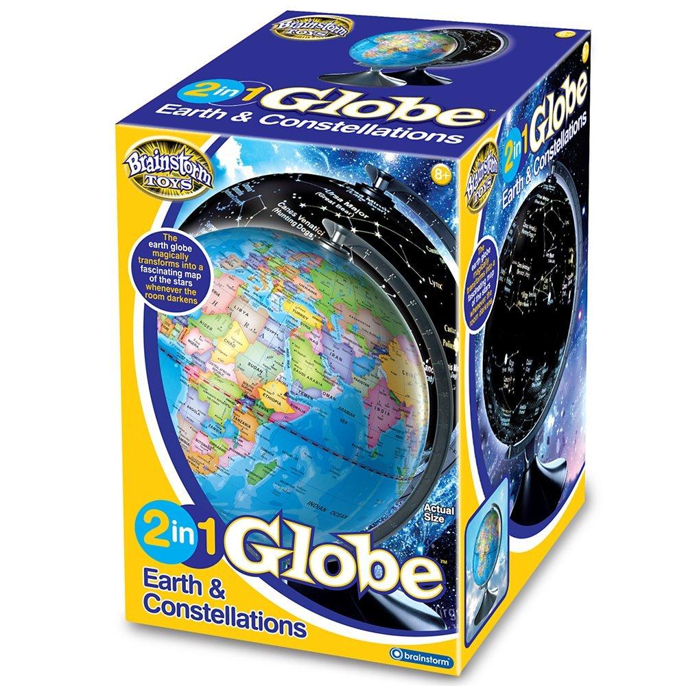 Earth by day, space by night: 2 globes in 1. Ideal for both would-be astronomers and budding geographers, this good-sized globe shows the world with political boundaries, natural features such as lakes and rivers, capitals and major cities.