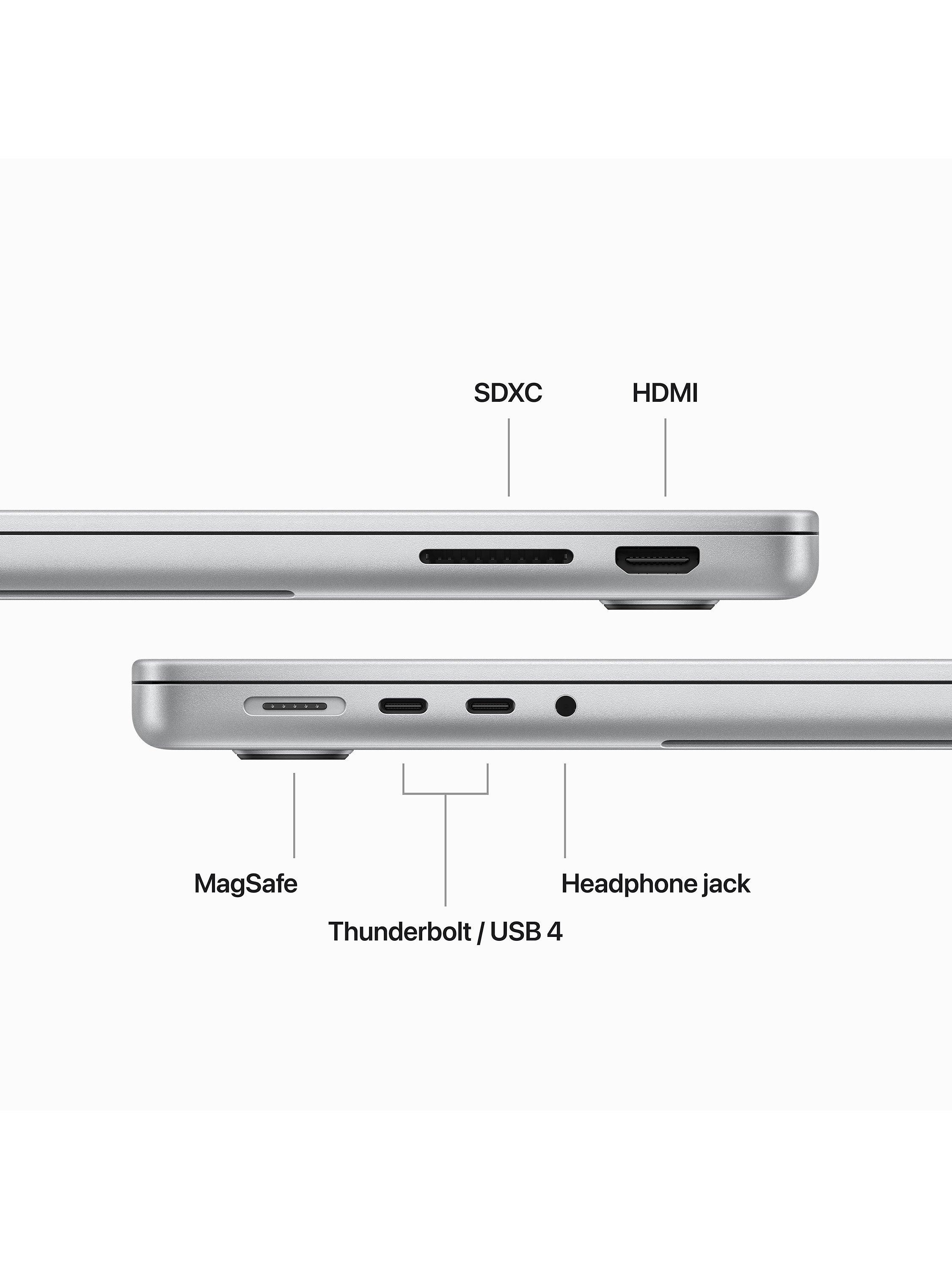 Transfer photos and videos with an SDXC card reader. Connect to TVs or displays with the HDMI output. Listen using a 3.5mm headphone jack that detects and automatically adjusts for high‑impedance headphones. Connect to high-speed peripherals or displays with multiple Thunderbolt 4 ports. And fast‑charge using the quick‑releasing MagSafe 3 port.