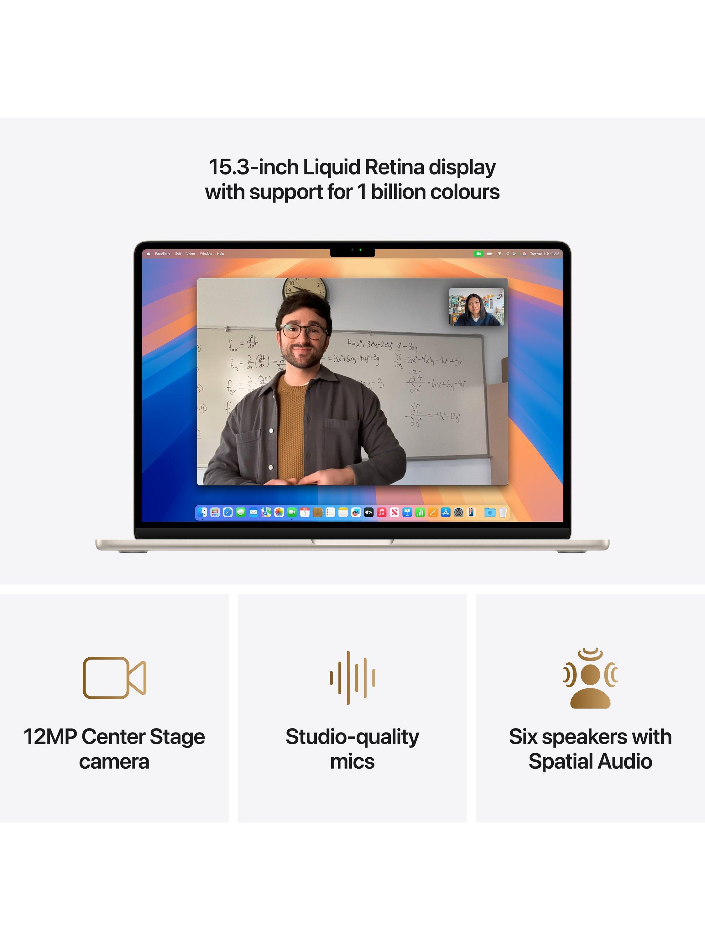The 15.3-inch Liquid Retina display supports one billion colours.[3] Photos and videos pop with rich contrast and sharp detail, and text appears super-crisp.