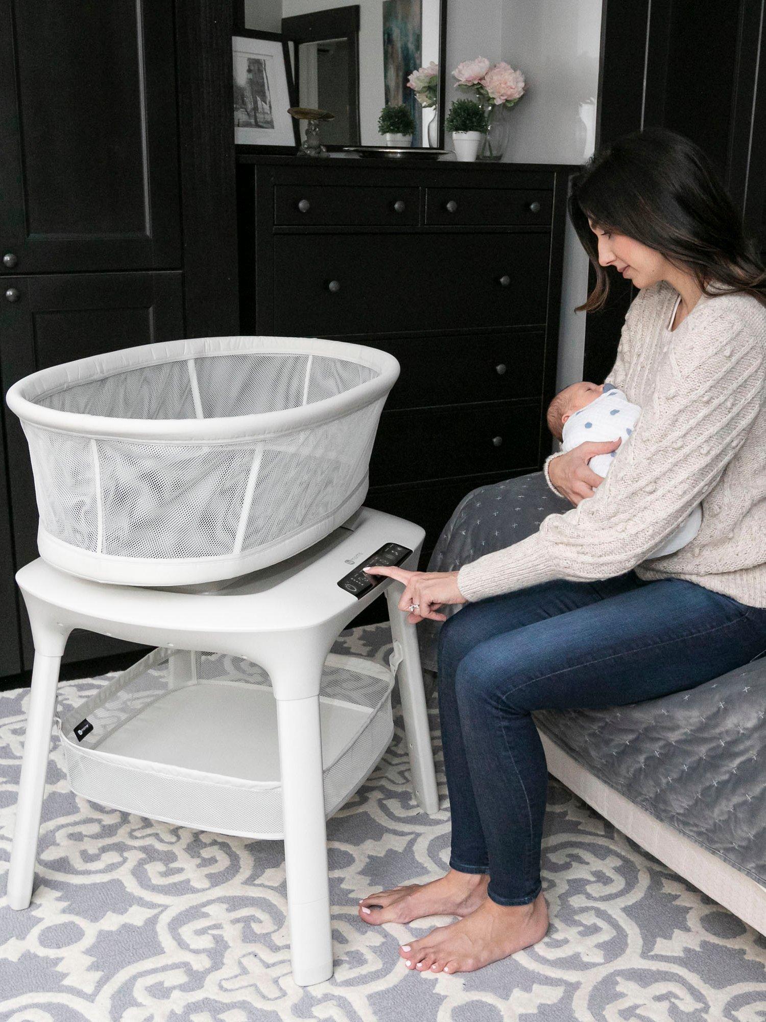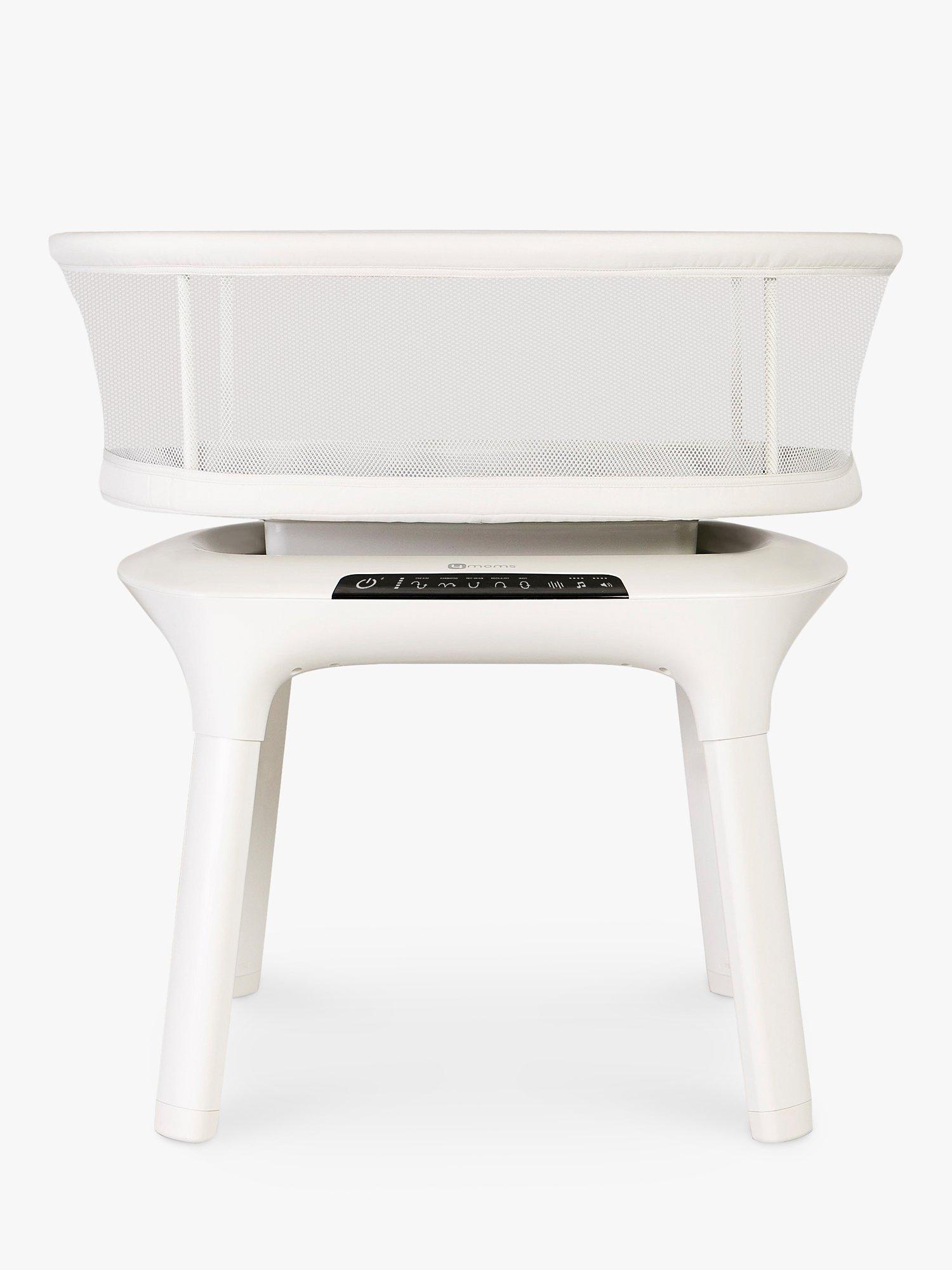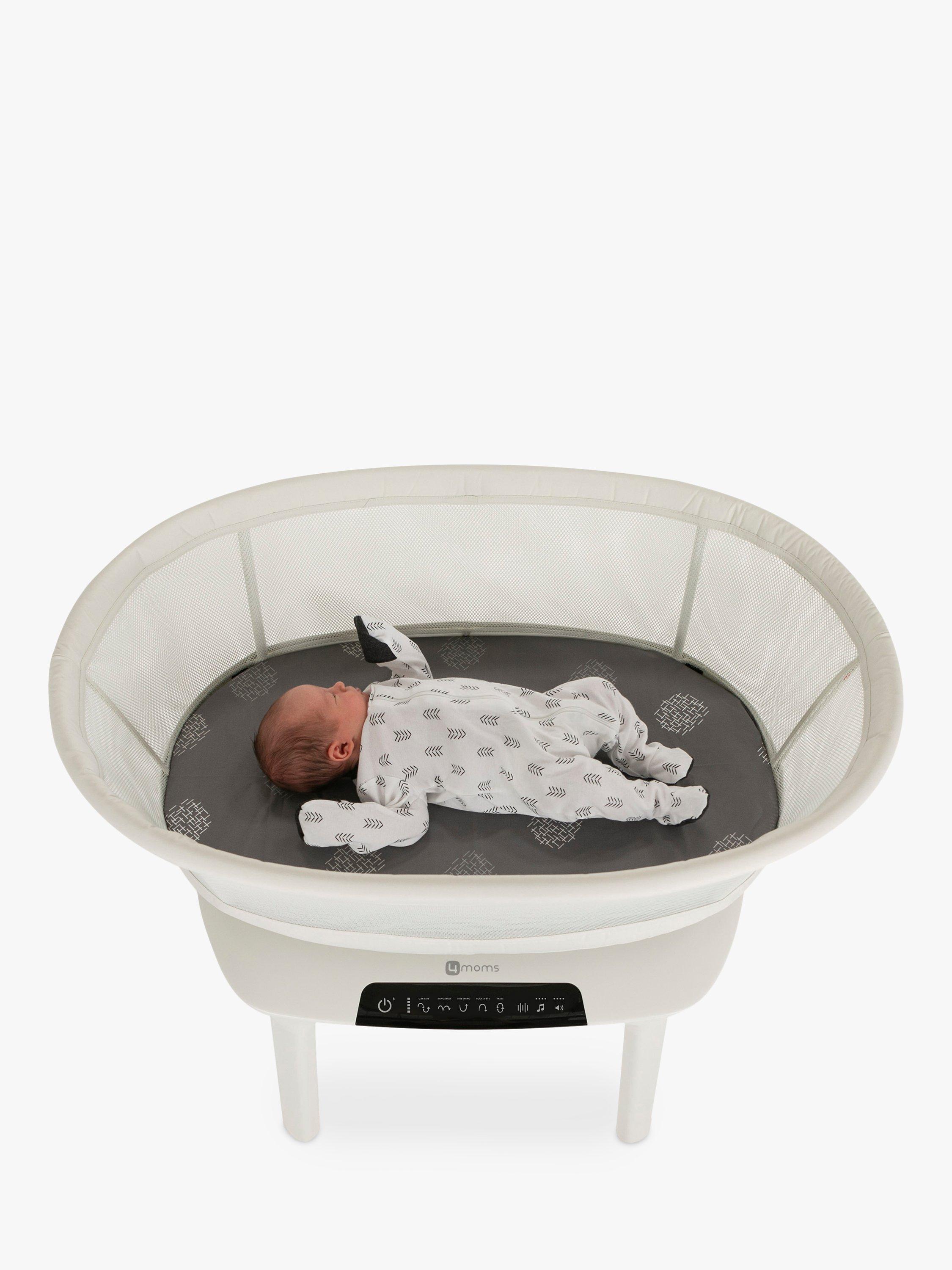 This 4moms MamaRoo sleep bassinet set includes a bassinet, a waterproof mattress and a fitted sheet. The design offers a firm, flat sleep surface with mesh sides for visibility and airflow. 5 unique motions - car ride, kangaroo, tree swing, rock a bye, and wave - are included to soothe and improve sleep.
