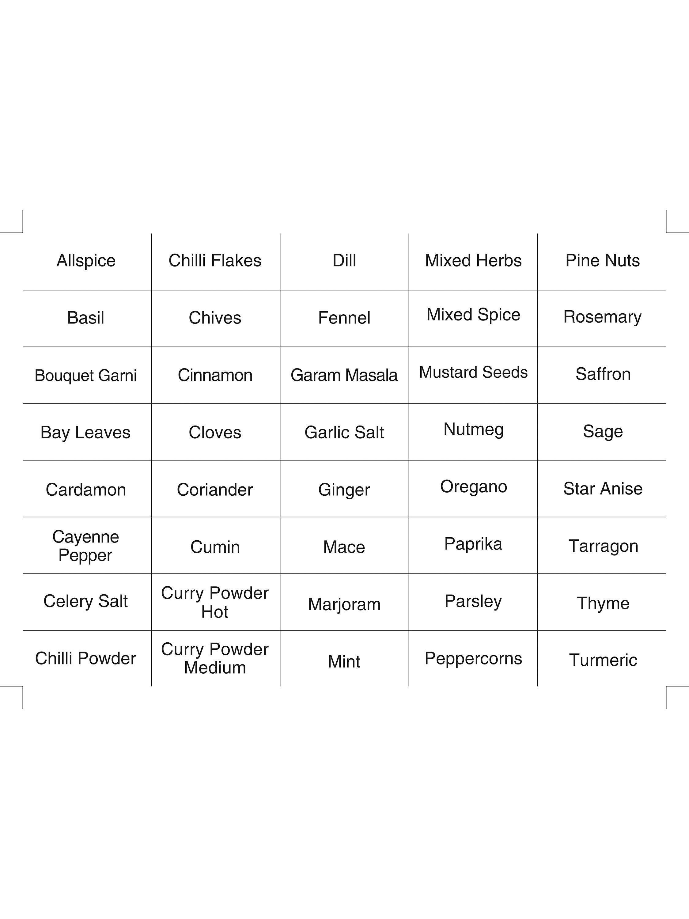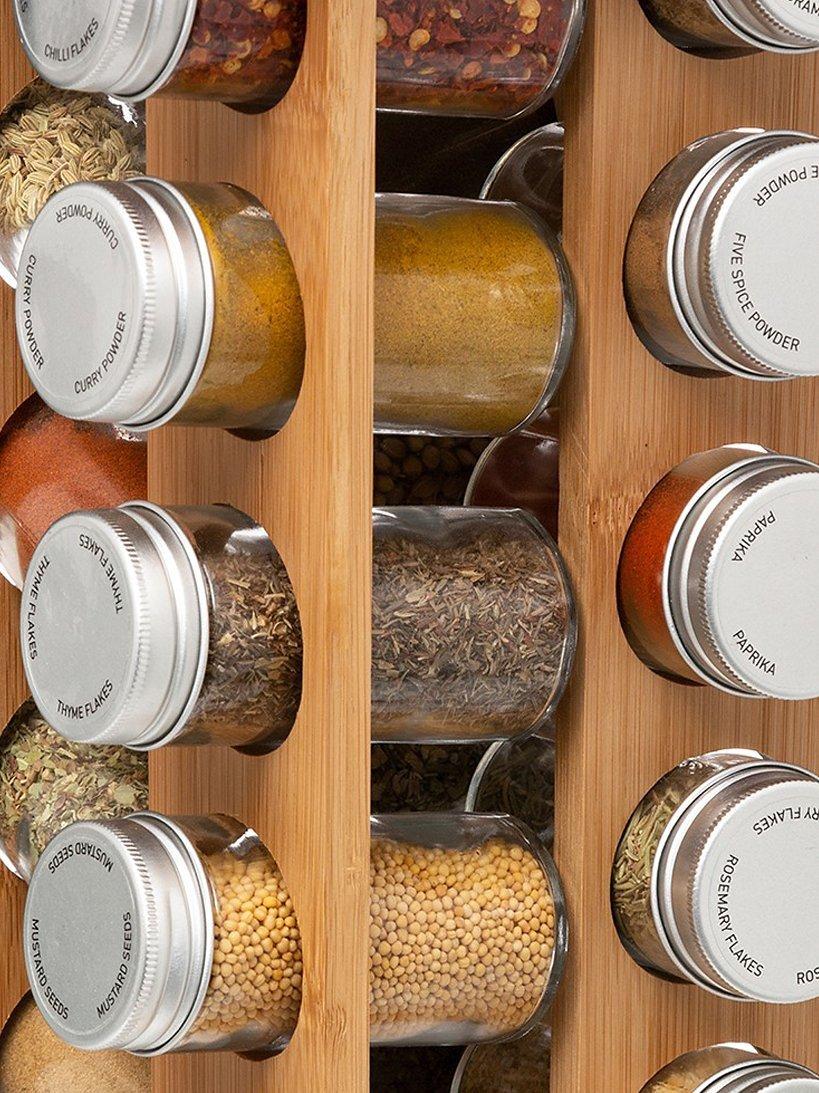 This filled bamboo spice rack allows you to efficiently combine a collection of your favourite flavours in the kitchen. The attractive twist-top glass jars make it easy to select just the right herb or spice for your recipes.