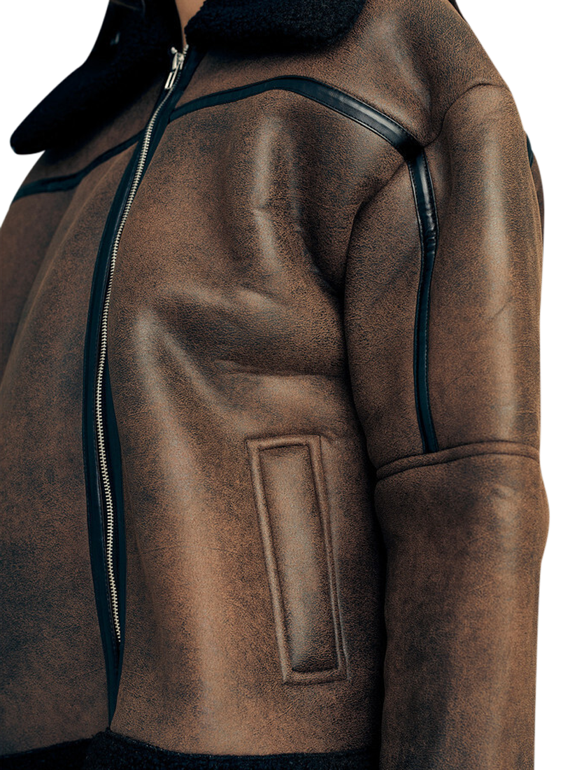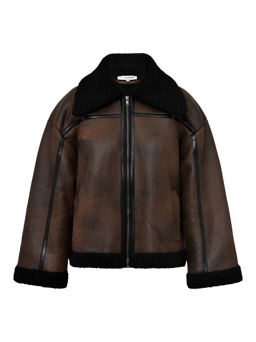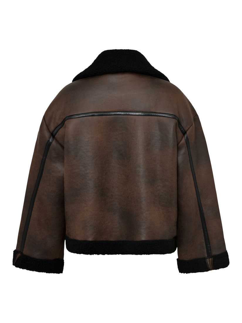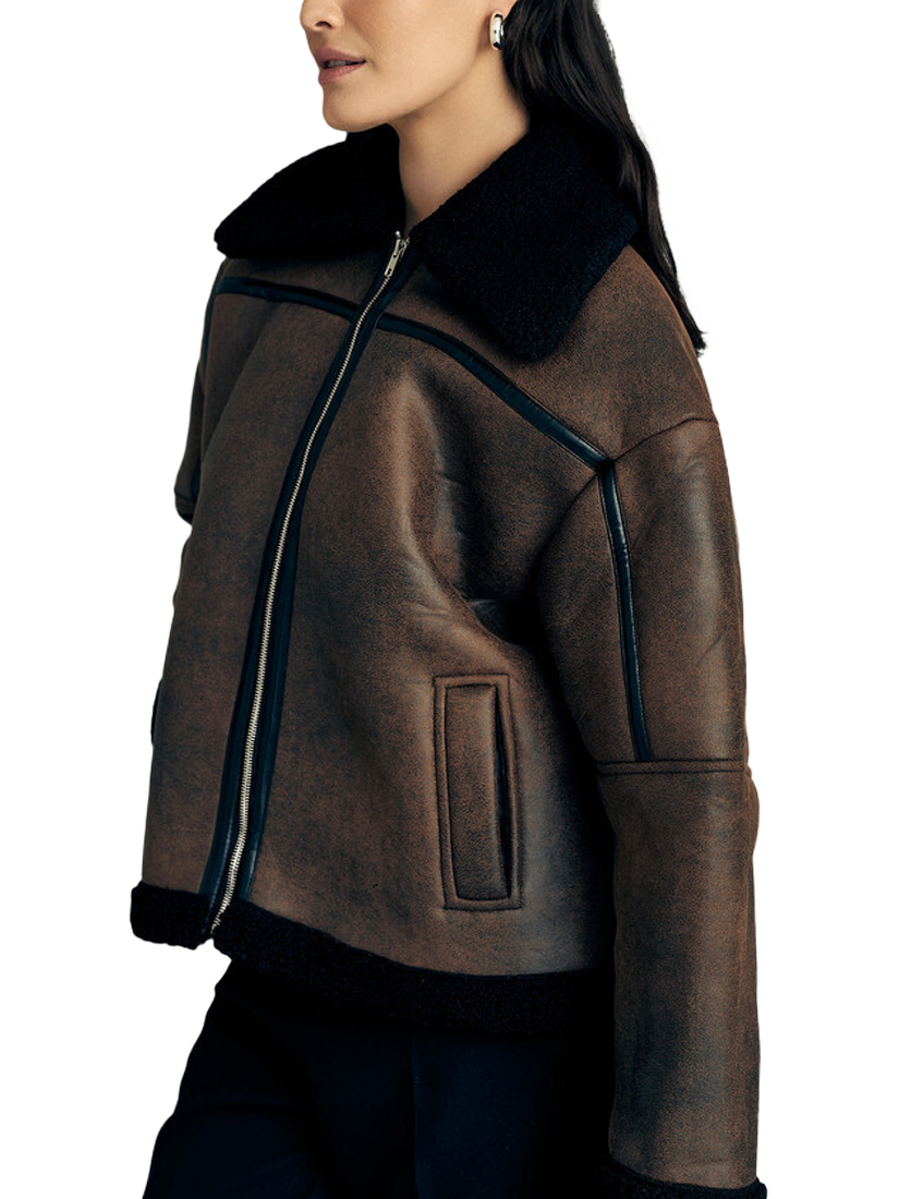 The Alise coat is a short shearling coat made of faux leather material. The coat features a collared neck, long sleeves, and has a teddy lining. The coat fits true to size.