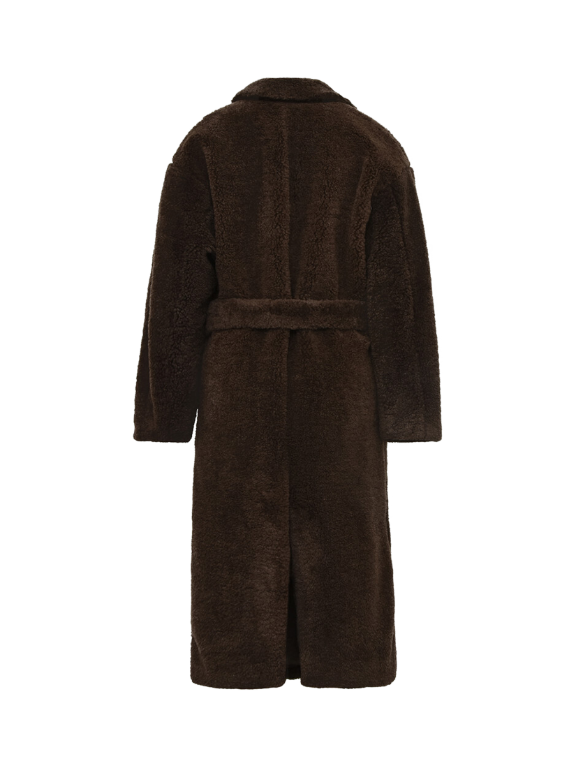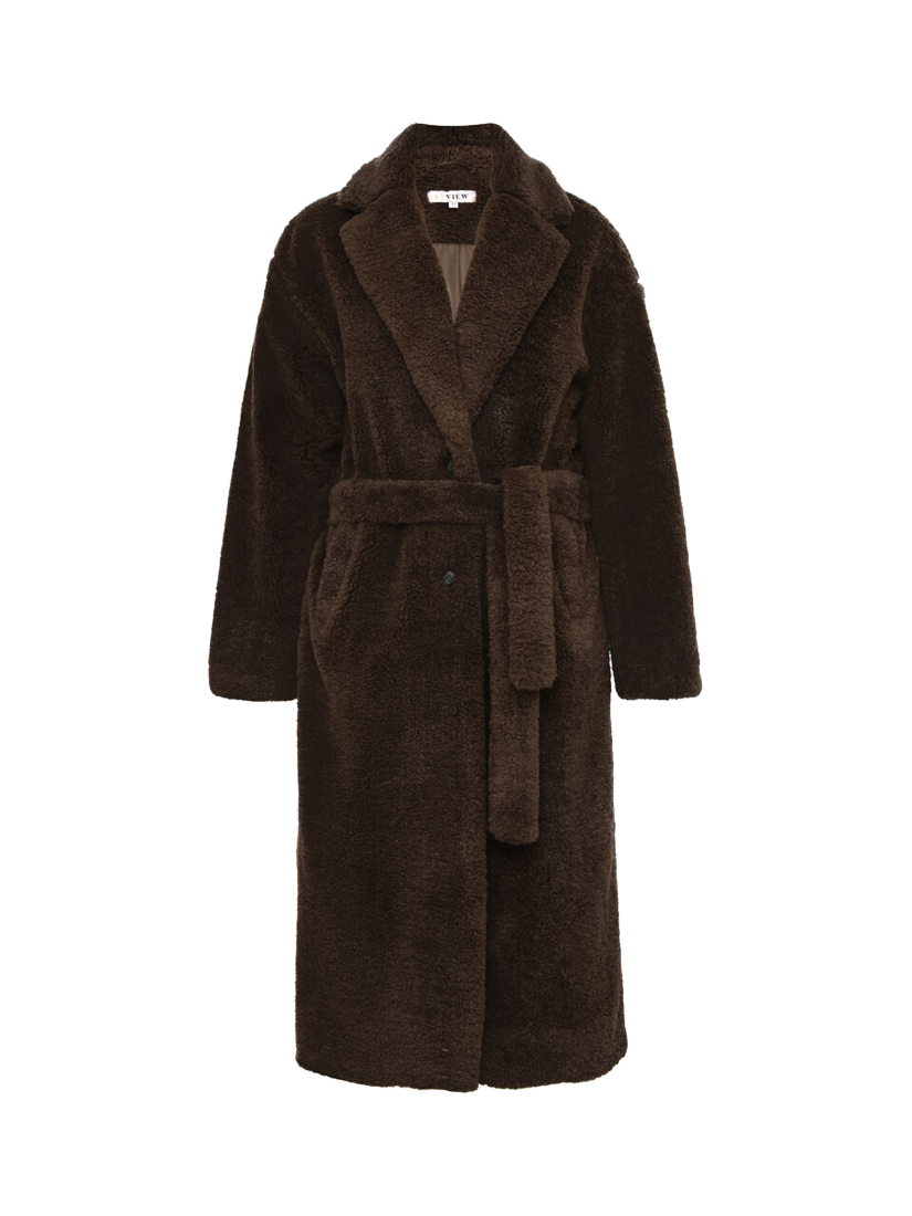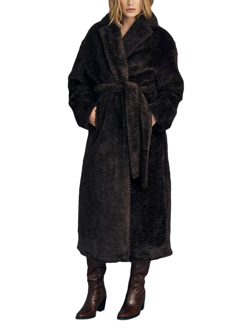 The Teddy Long Coat is a long coat made of teddy material. The coat features a V-neckline, long sleeves, and closes with a tie belt at the waist.