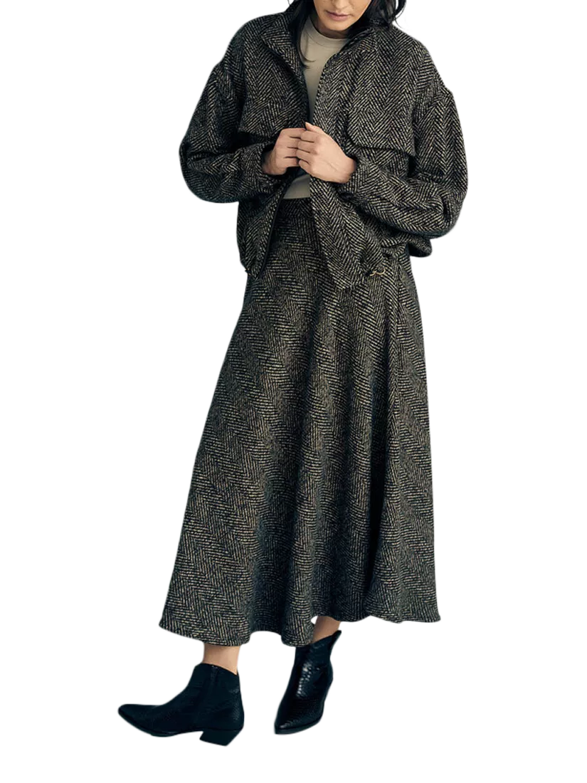 The Catie Skirt is a maxi skirt in herringbone pattern. The skirt features an elastic waistband. The skirt fits true to size.
