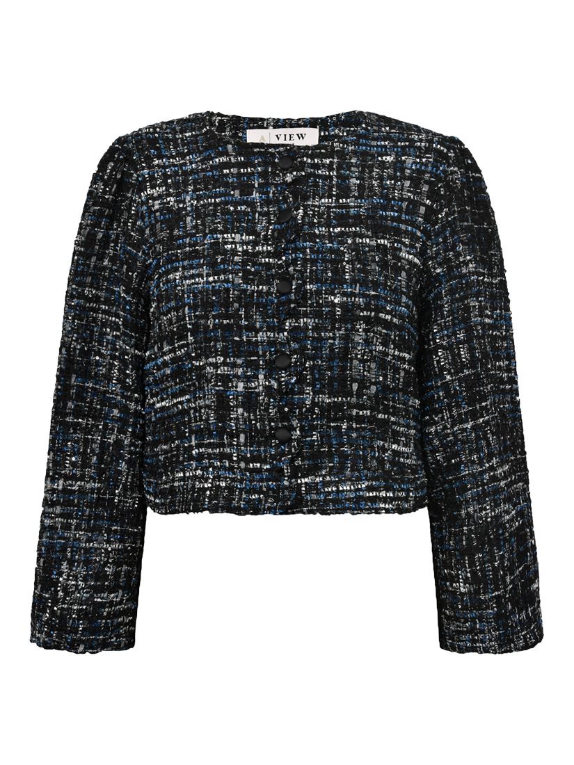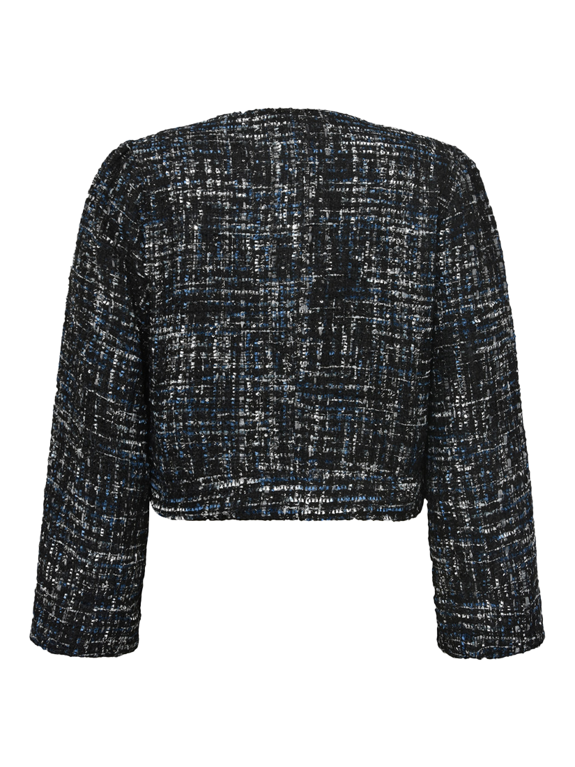 The Cennet jacket is a short jacket made of a textured material. It has puff shoulders with elastic cuffs. The jacket closes in the middle with buttons made of the same material as the jacket. It has no pockets.