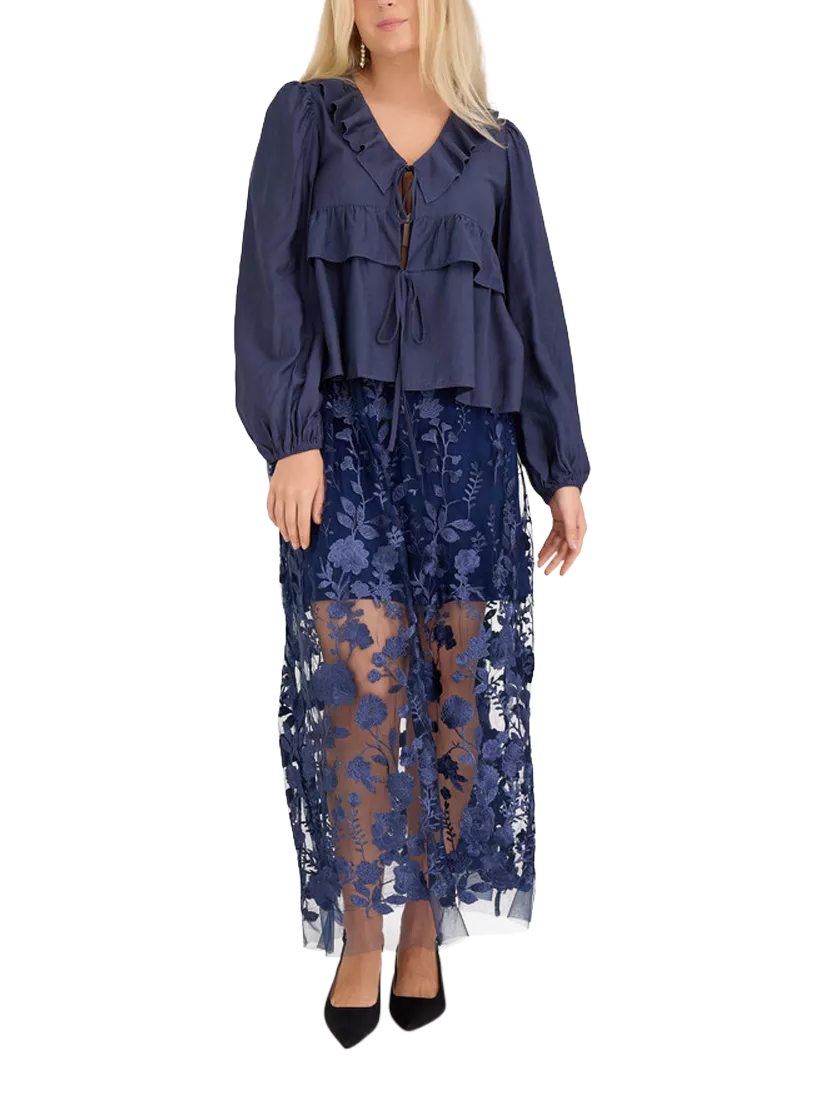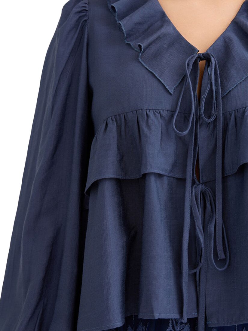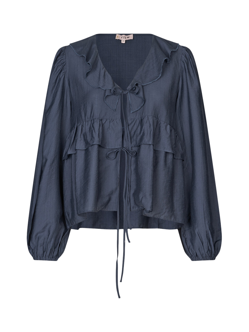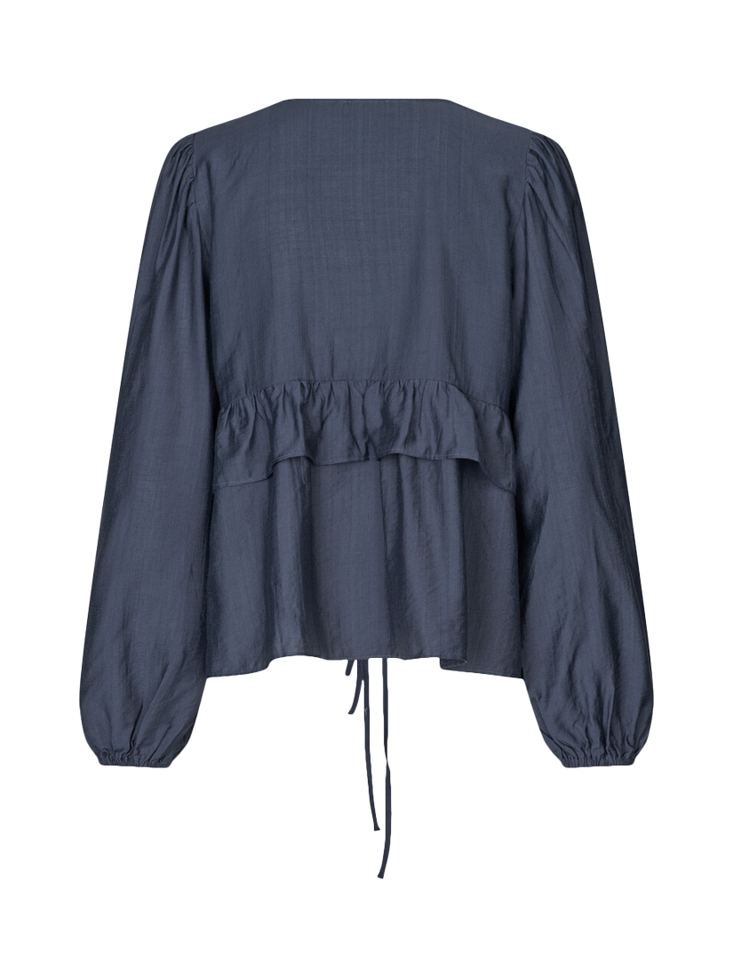 The Charlotte blouse is a blouse with ties. The blouse has long sleeves and a V neck. The blouse is normal in size.