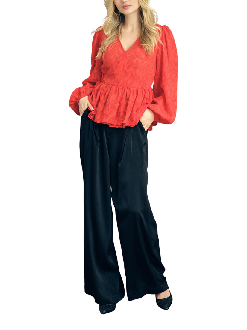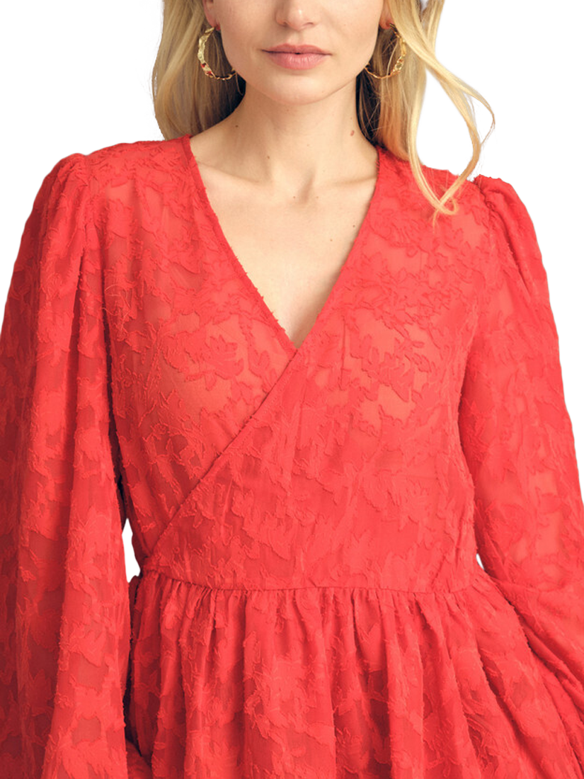 The Feana blouse is a wrap blouse with long loose balloon sleeves and a tie that is tied at the side. The blouse is made of a light material with floral jacquard pattern.