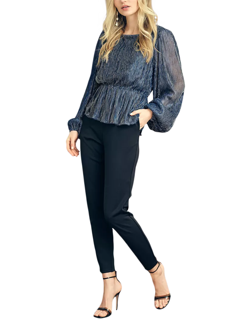 The Fiba blouse is a loose-fitting blouse, that cinches at the waist with an elastic band. The blouse has long, loose sleeves made by a glitter material.