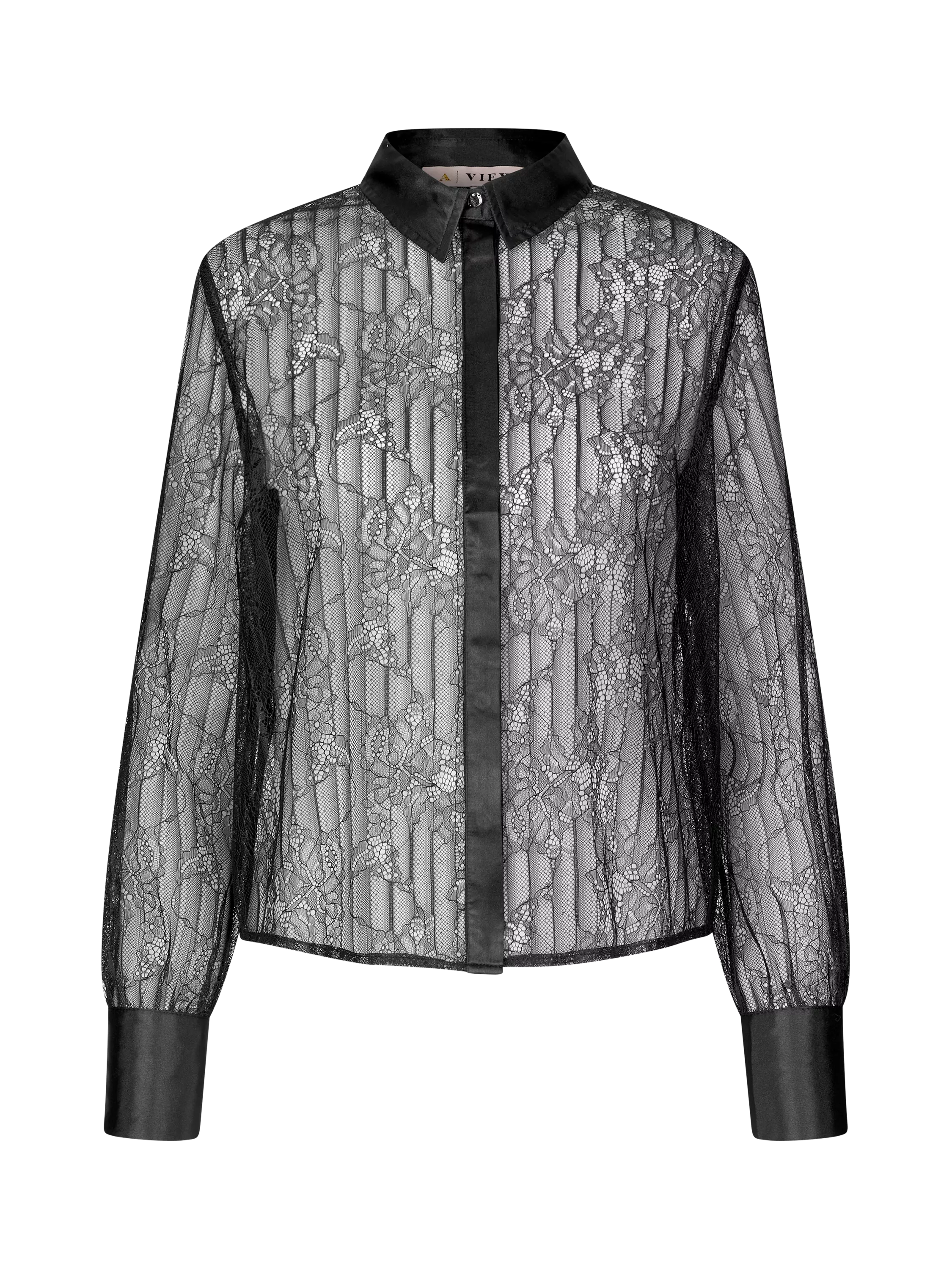 The Florence lace shirt is made in a transparent lace material. It has a concealed placket closure along the entire length of the shirt. The sleeves end in a classic cuff, fastened with silver buttons.