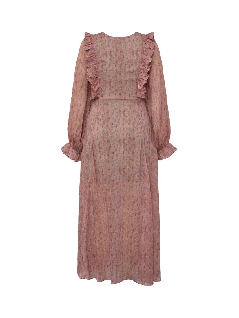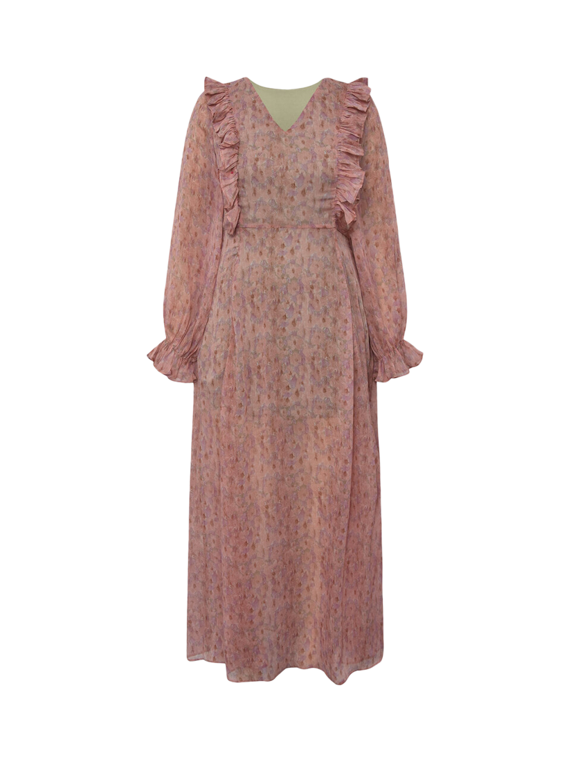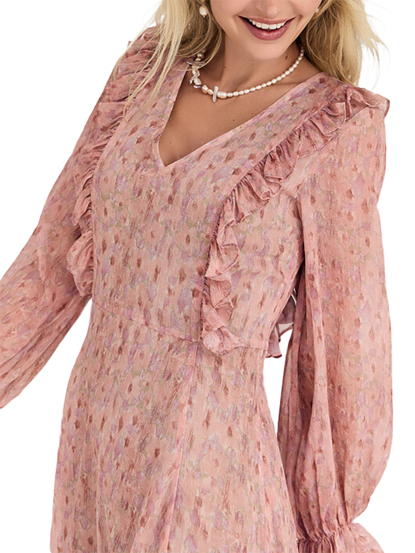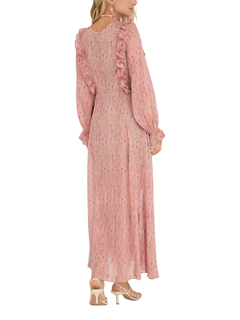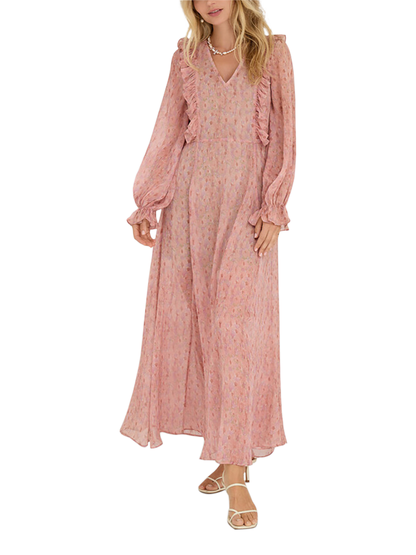 Set in a softly flowing A-line shape, this floor-length dress from A-VIEW is from a light chiffon-style fabric with ruffle details. With a universally flattering v-neckline and long sleeves with elasticated fluted cuffs, it is printed in positively swoon-worthy spots.