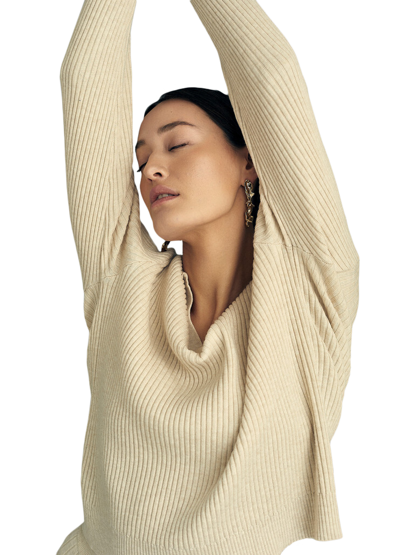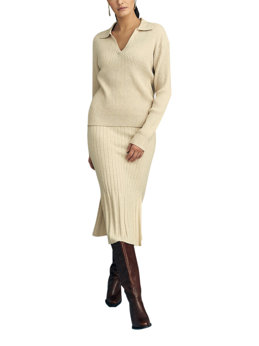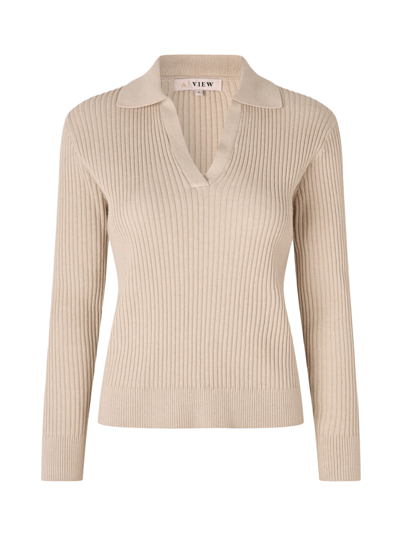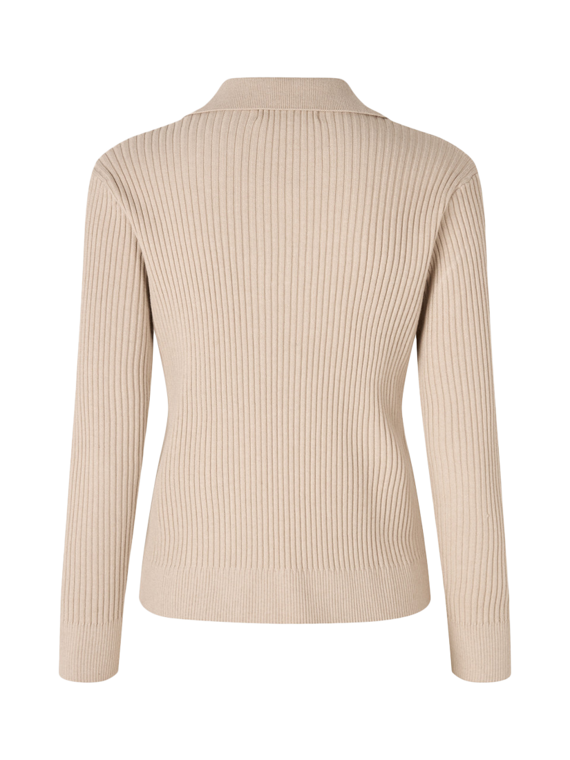The Freja knit blouse is a long-sleeved blouse in knitted rib pattern. The blouse features a collar and V-neckline. The blouse fits true to size.