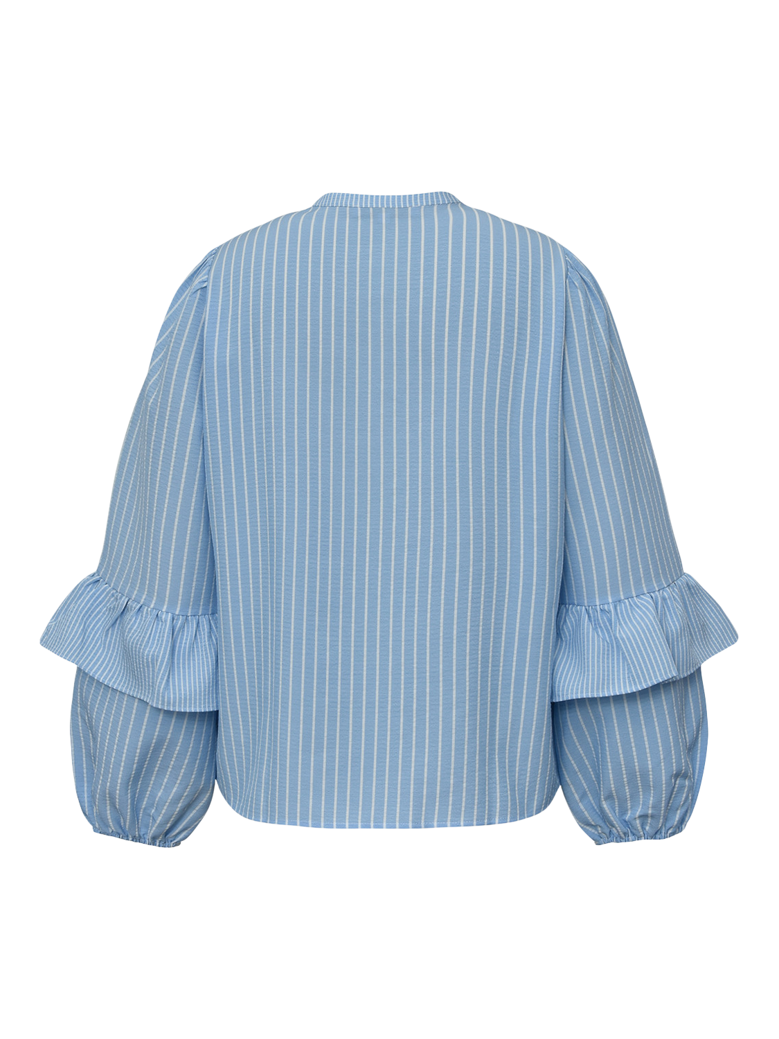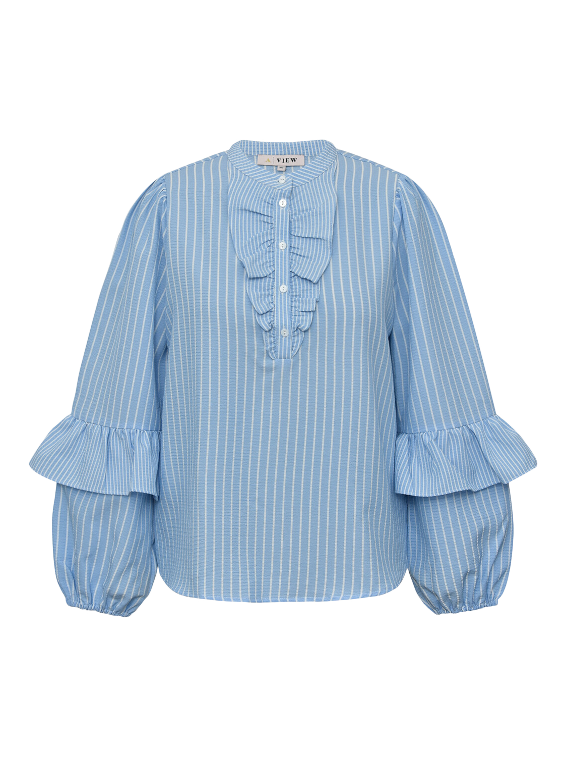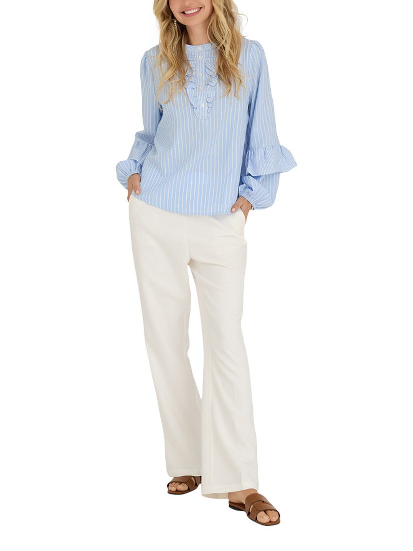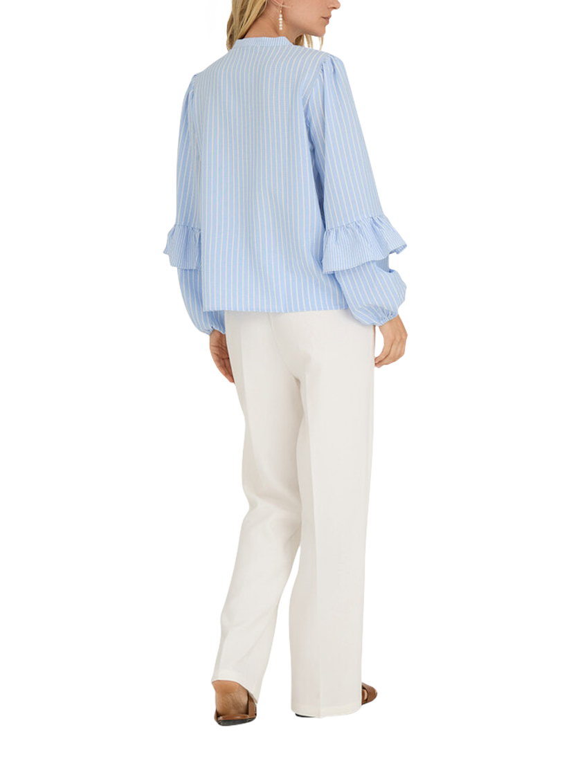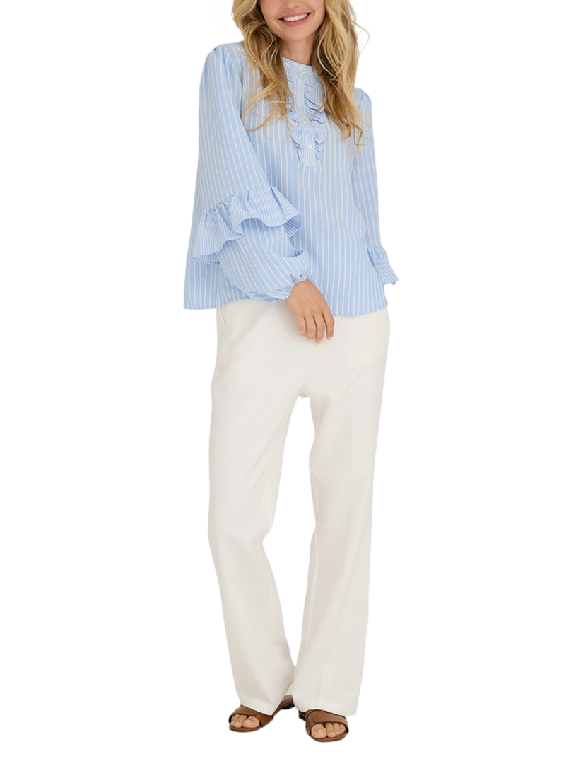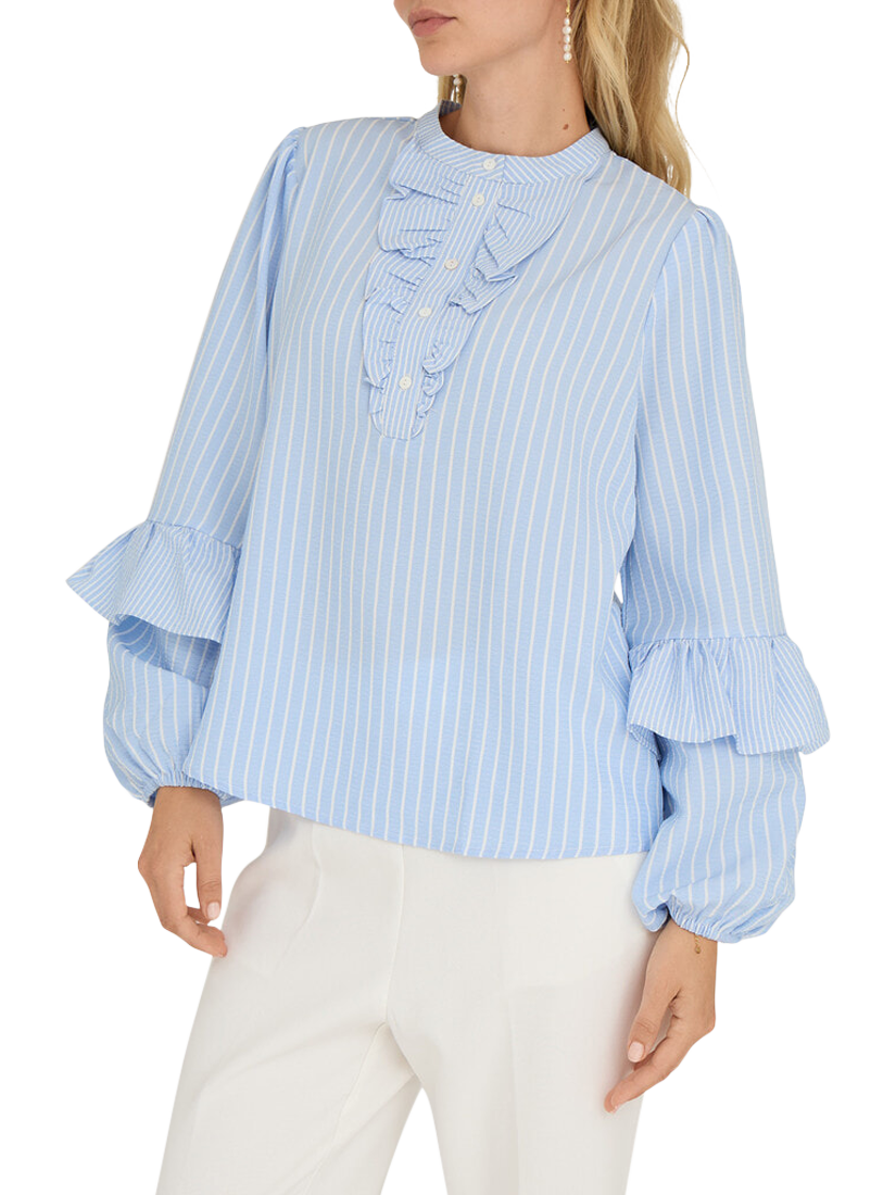 Updating your collection, this shirt by A-VIEW flatters the figure with its striped pattern. Keeping it classic with a crew neck and long sleeves, it is made from soft fabric with ruffles on the wide sleeves and yoke.