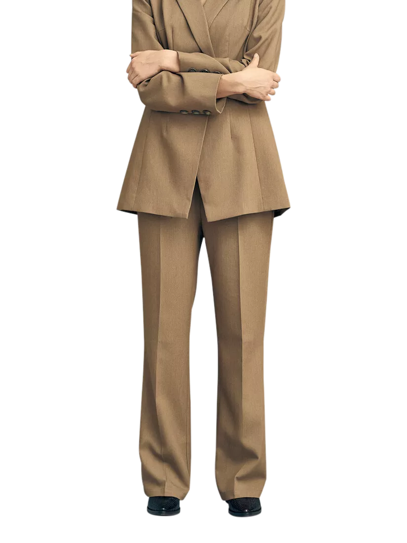 The Kelly trousers are high-waisted, classic trousers with a fixed waistband at the front and an elastic waistband at the back. They have a loose fit with a flare effect at the bottom. The blazer is true to size.