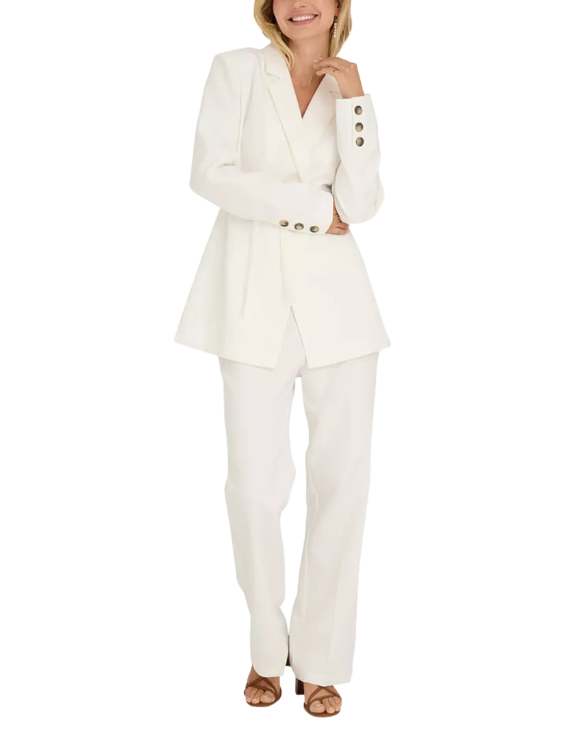 The Kelly trousers are high-waisted, classic trousers with a fixed waistband at the front and an elastic waistband at the back. They have a loose fit with a flare effect at the bottom. The blazer is true to size.