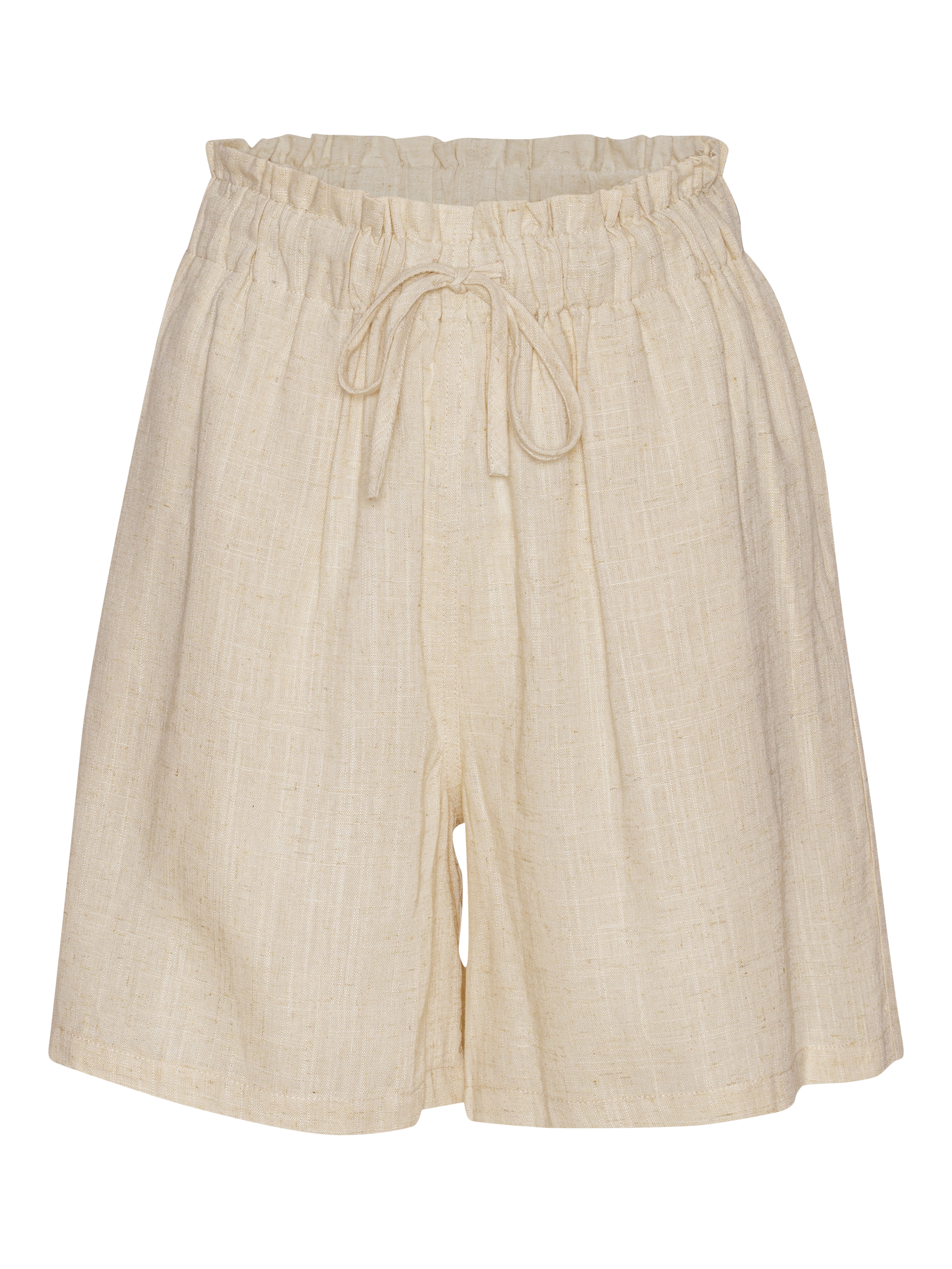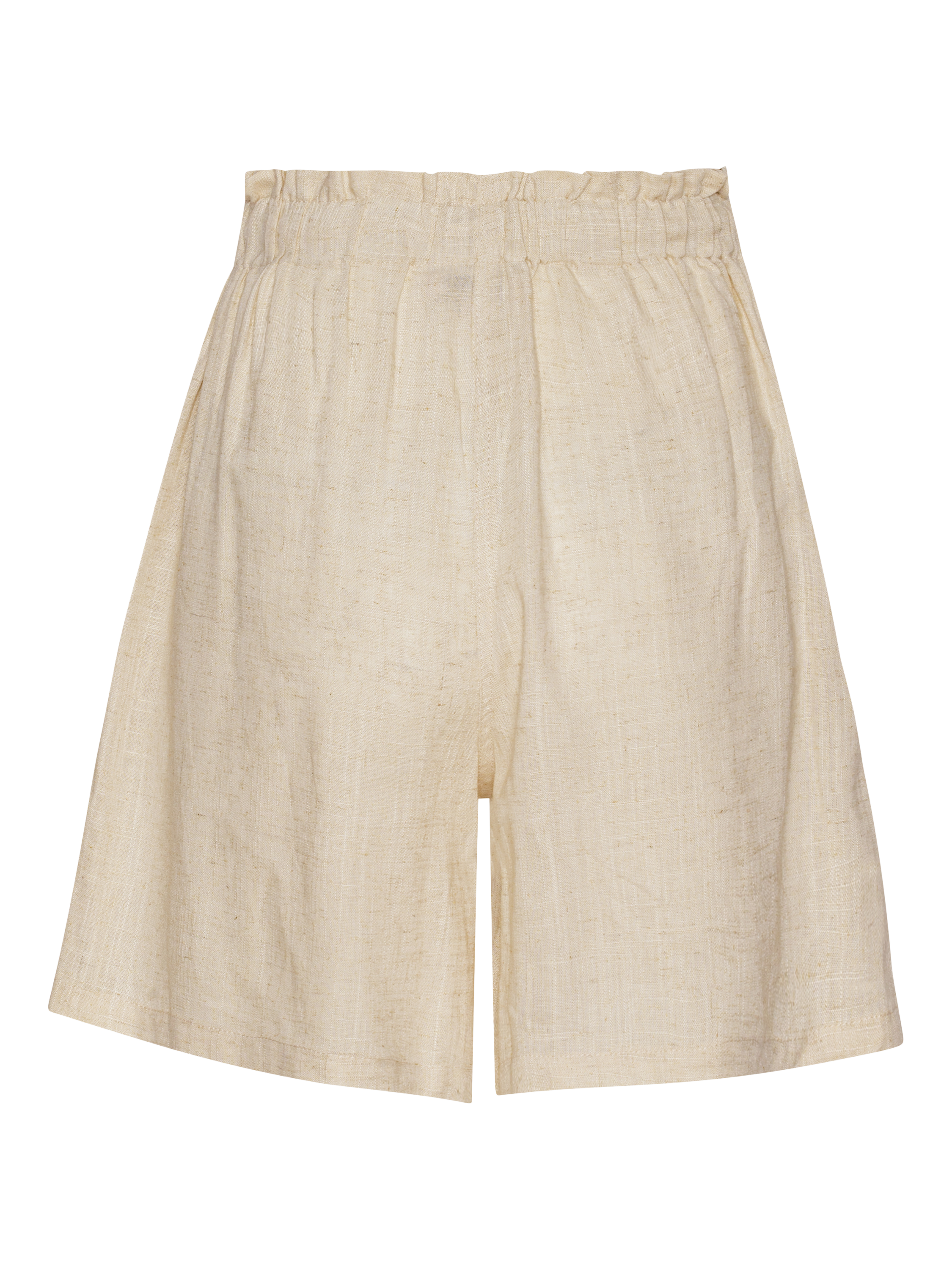 Lerke shorts are medium-length shorts in a soft linen quality. The shorts have elastic at the waist and are tied at the waist with laces. They have a small ruffled edge at the top and wide legs.