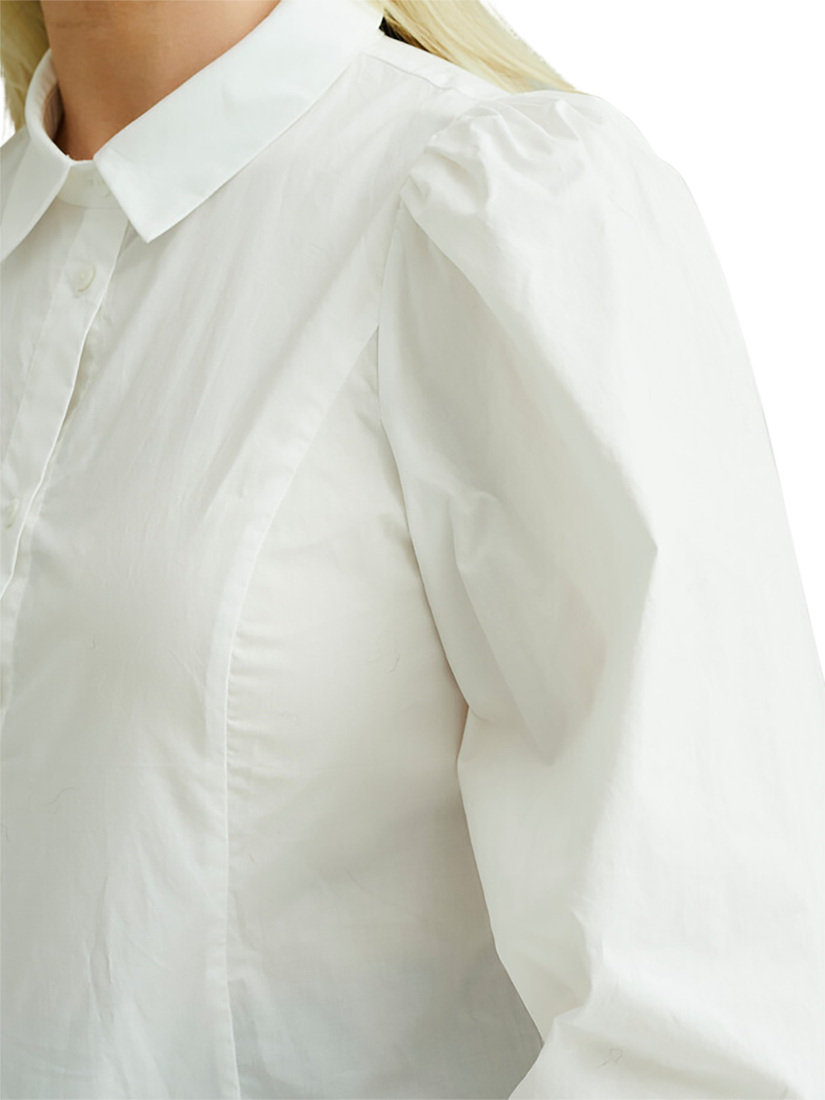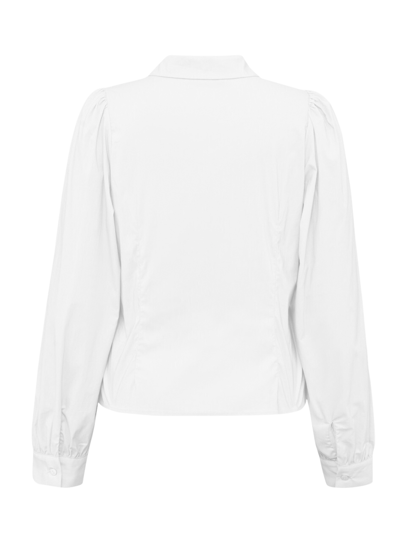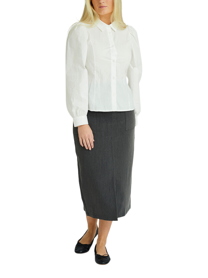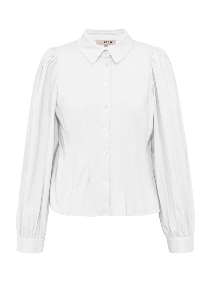 The Malika shirt is a long-sleeved shirt with a fitted fit. The shirt features a collar, button closure, and sleeves with a puff effect. The shirt fits true to size.