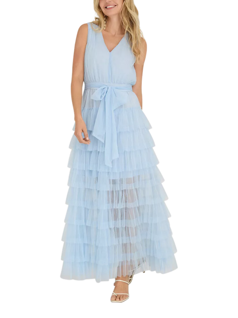 With endless layers through the semi-sheer skirt, this maxi dress from A-VIEW is the epitome of events elegance. With a v-neckline and a flattering tie waist, pair with simple heels.