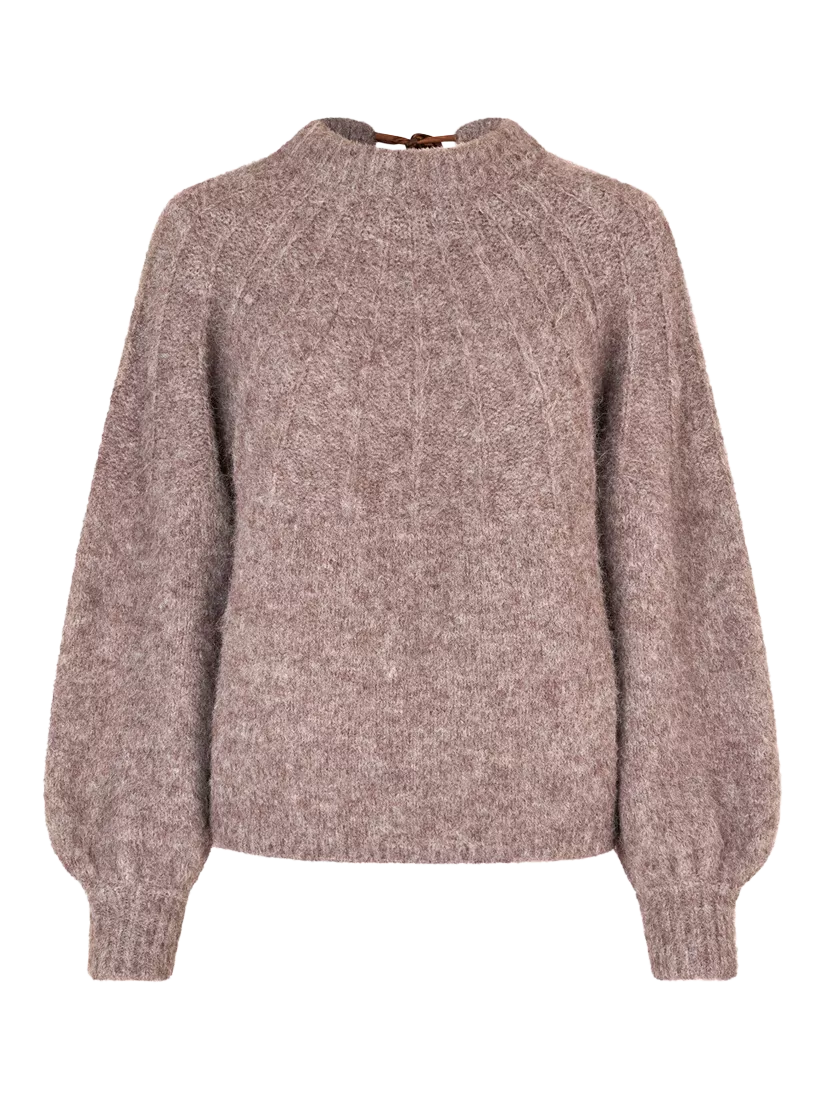 The Patrisia bow knit pullover is a loose-fitting knit with relaxed sleeves and a vertical pattern. The sweater has an open back and ties at the neck with a ribbon. The sweater has an oversized fit.