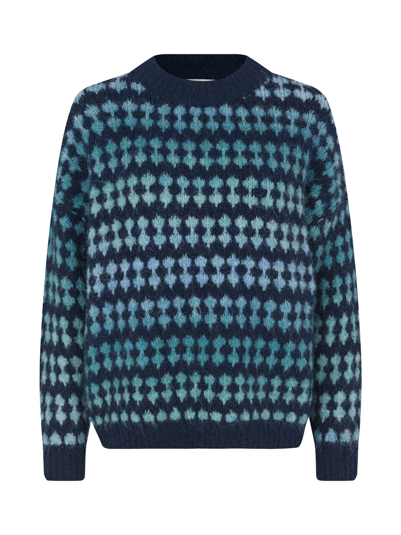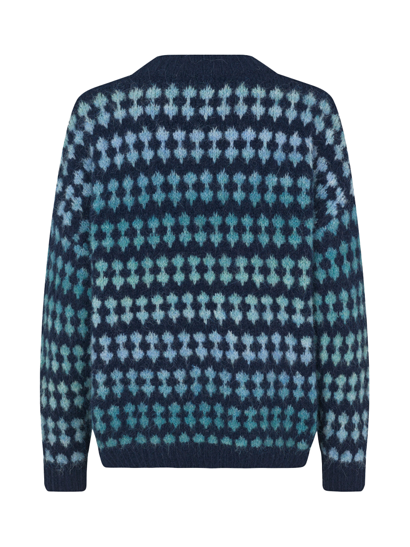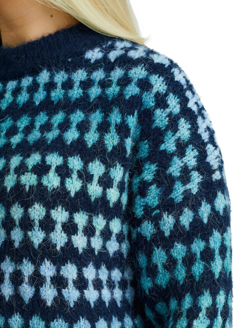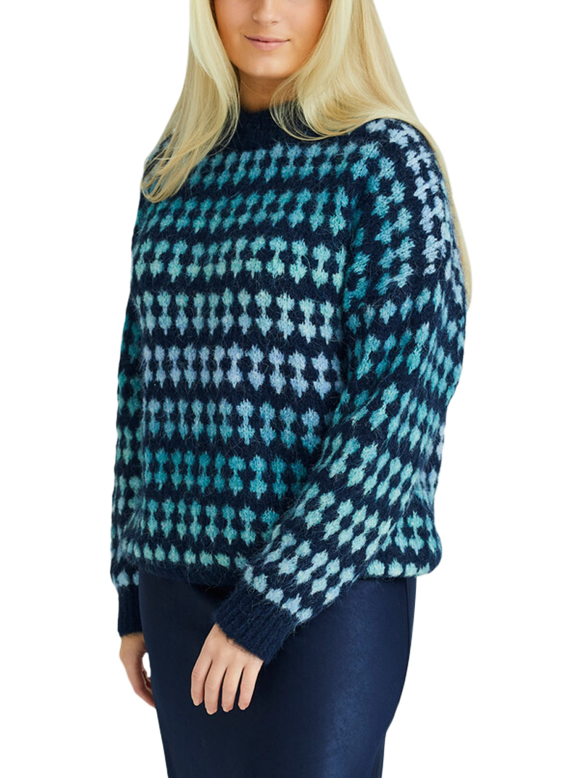 The Patrisia knit pullover is a high neck knit with a dotted pattern. The knit has long loose sleeves and a loose fit. The knit is normal in size.