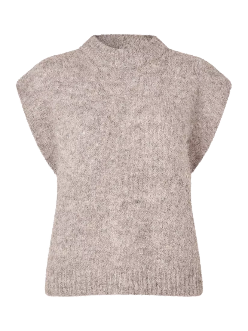 The Patrisia knit vest is a loose knitted vest with drop shoulder design. The vest is made of a soft material and features a round neckline with ribbed edges. The vest fits true to size.