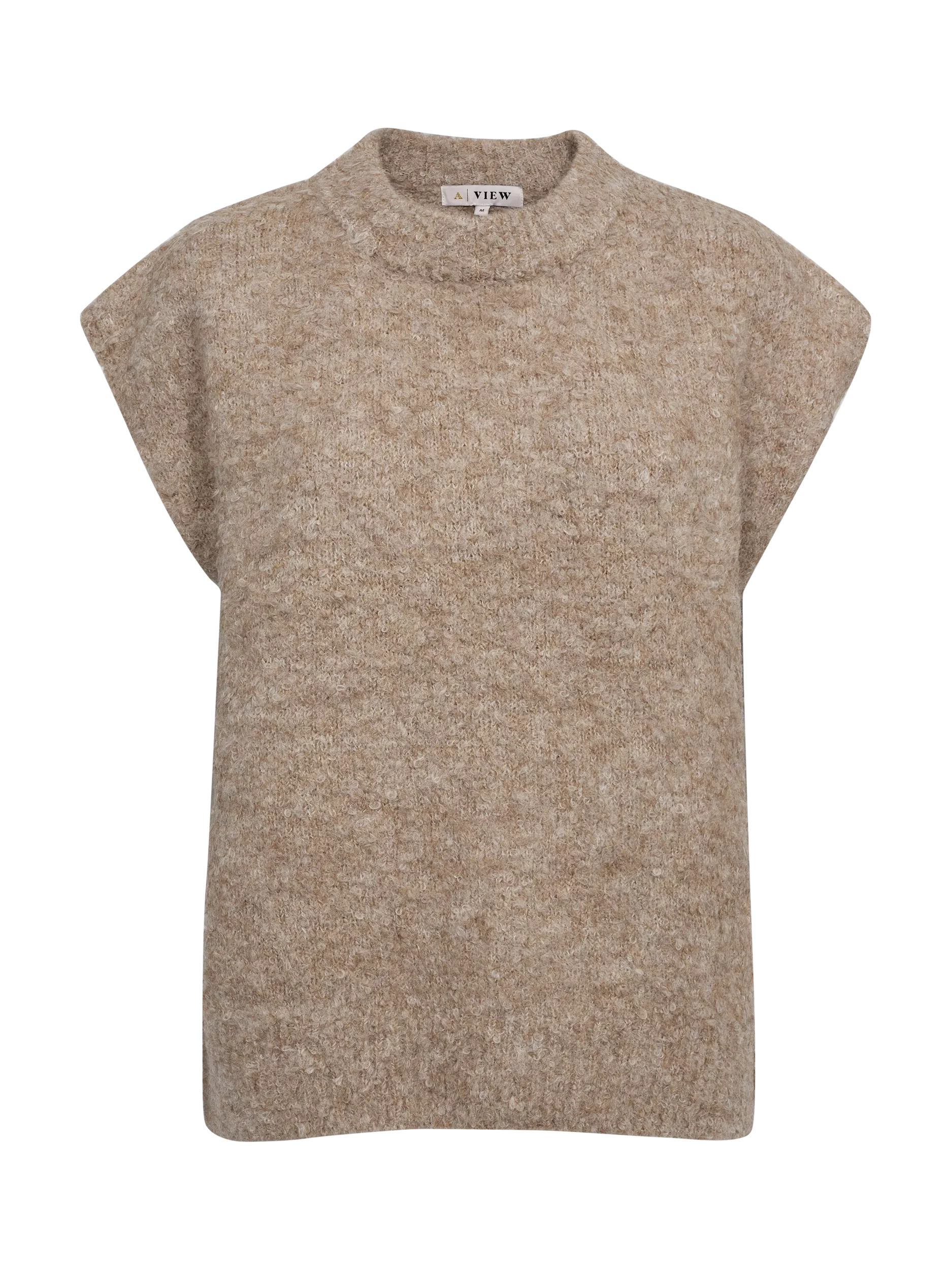 The Patrisia Knit Vest is a loose knitted top with dropped shoulder seams. The vest is made from a soft fabric and features a round neckline with ribbed trim.