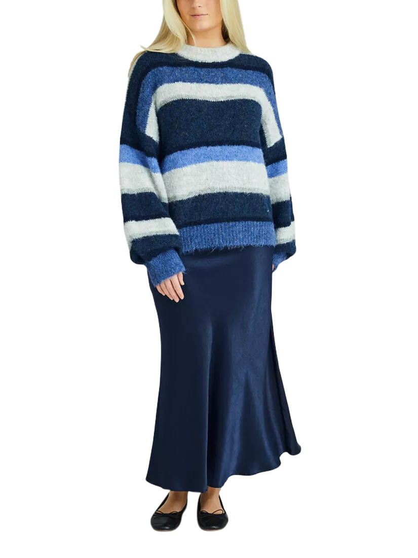 The Patrisia stripe pullover is an oversized knit with drop shoulder sleeves and stripes. The sleeves are loose with a puff effect, and the knit features a round neckline.The knit has an oversized fit.
