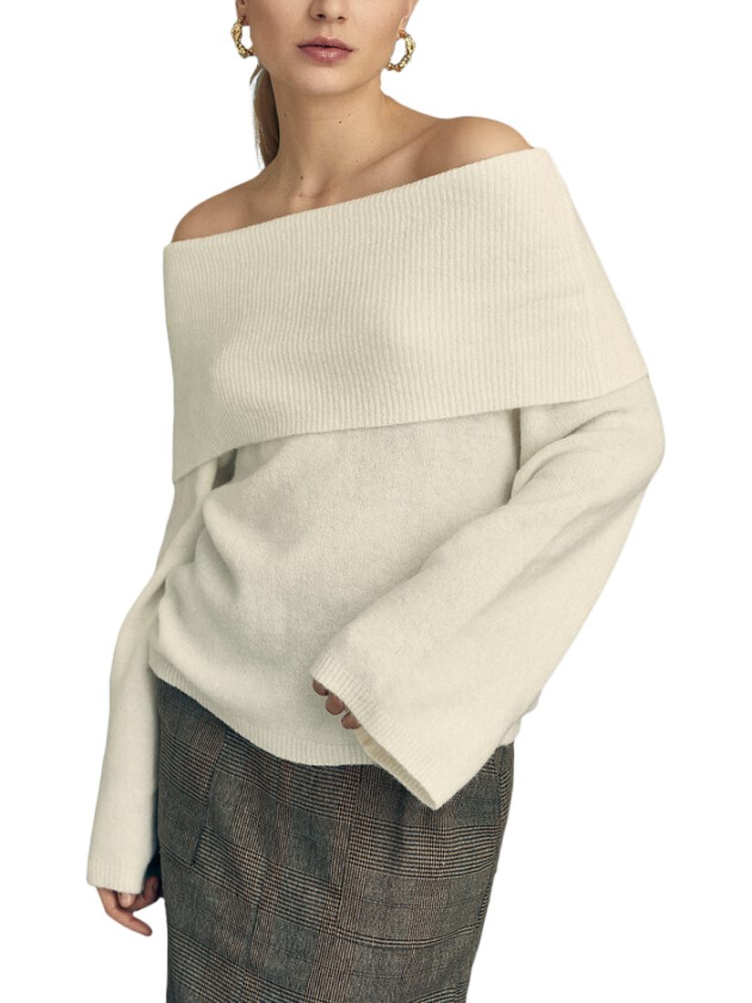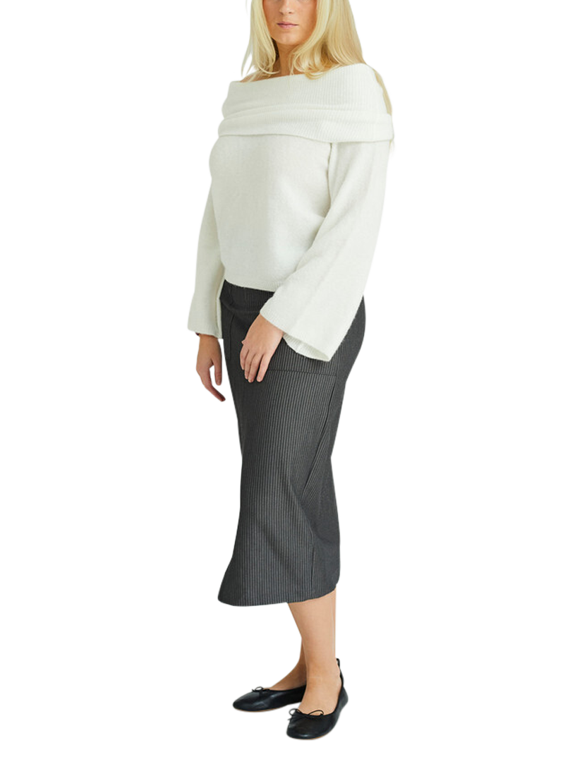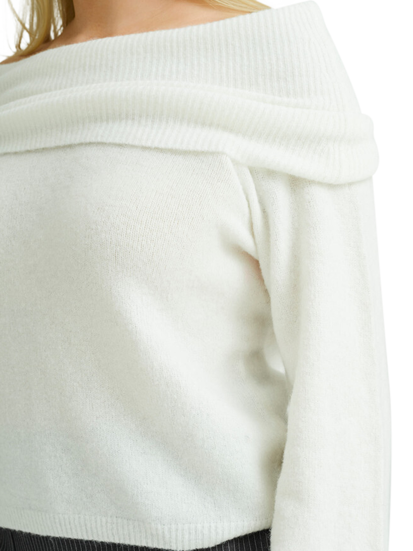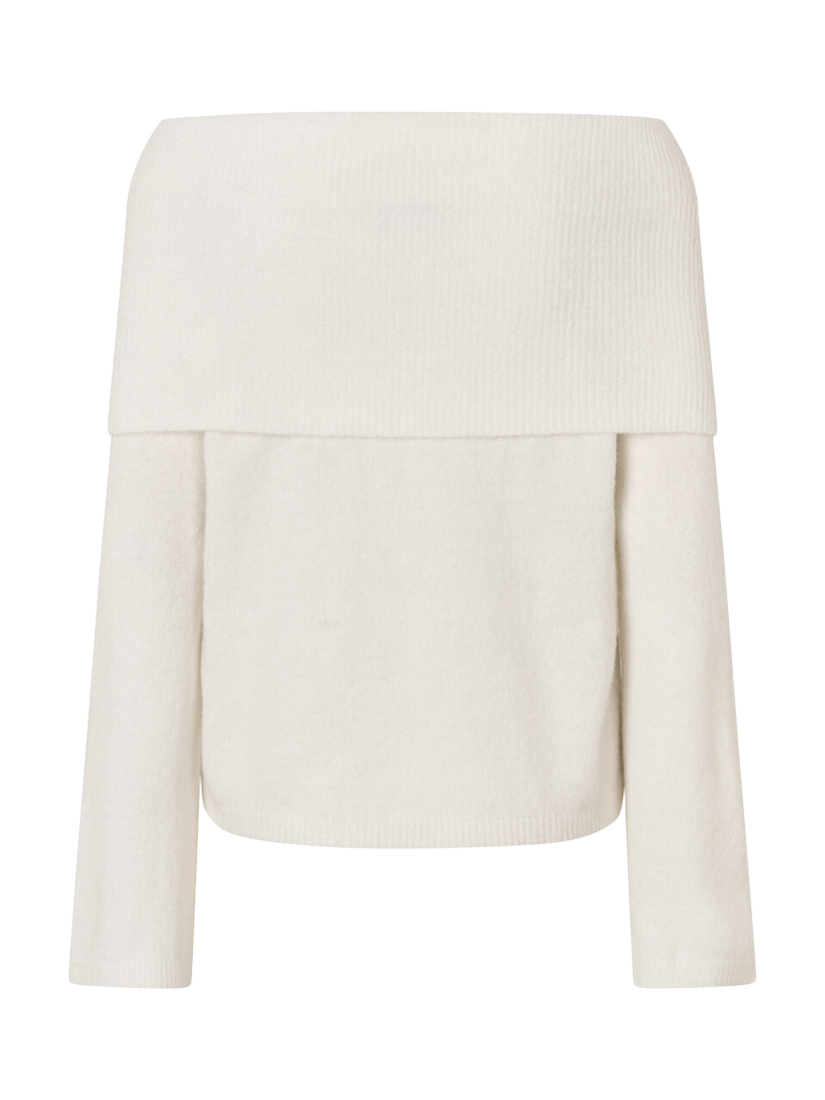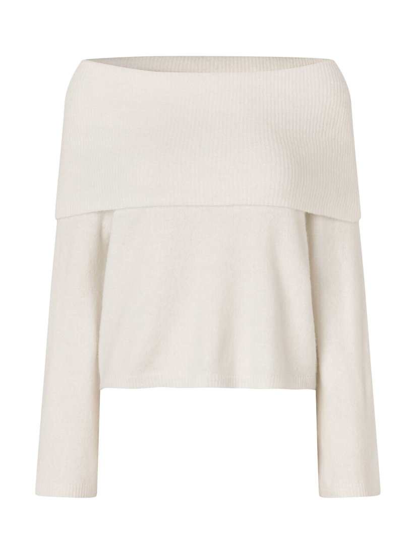 The Penny off-shoulder knit jumper is a loose-fitting knit with an off-shoulder effect. The knit features long, loose sleeves and a wide piece that folds down over the shoulders. The knit has an oversized fit.