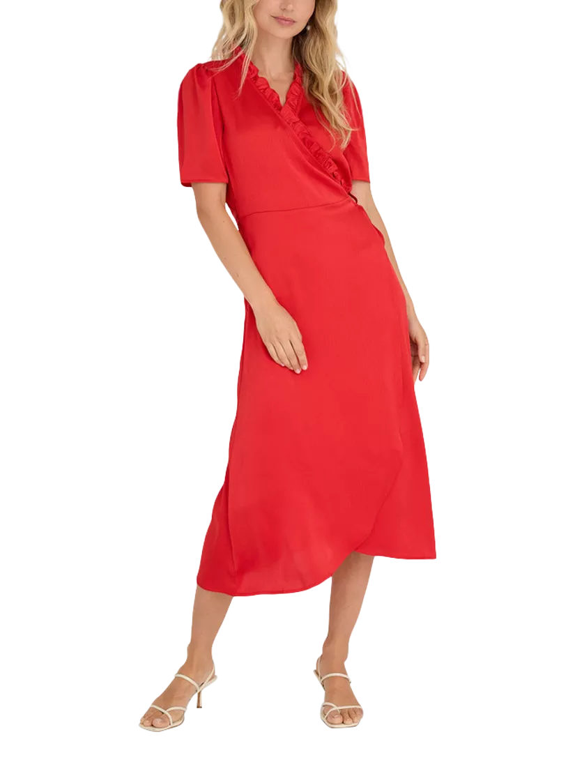 In a wrap shape that really flatters, this mid-length dress from A-VIEW comes in soft satin. With a feminine ruffled neckline and short sleeves, this style closes with ties to either side.