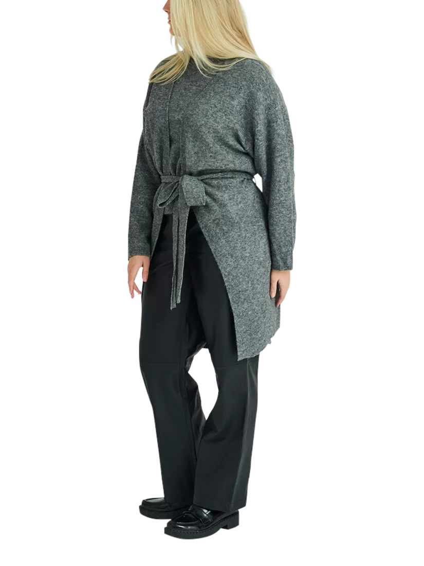 The Pony knit cardigan is a long knitted cardigan. It features dropped shoulder sleeves and a V-neckline. The cardigan is tied at the waist. The cardigan fits true to size.