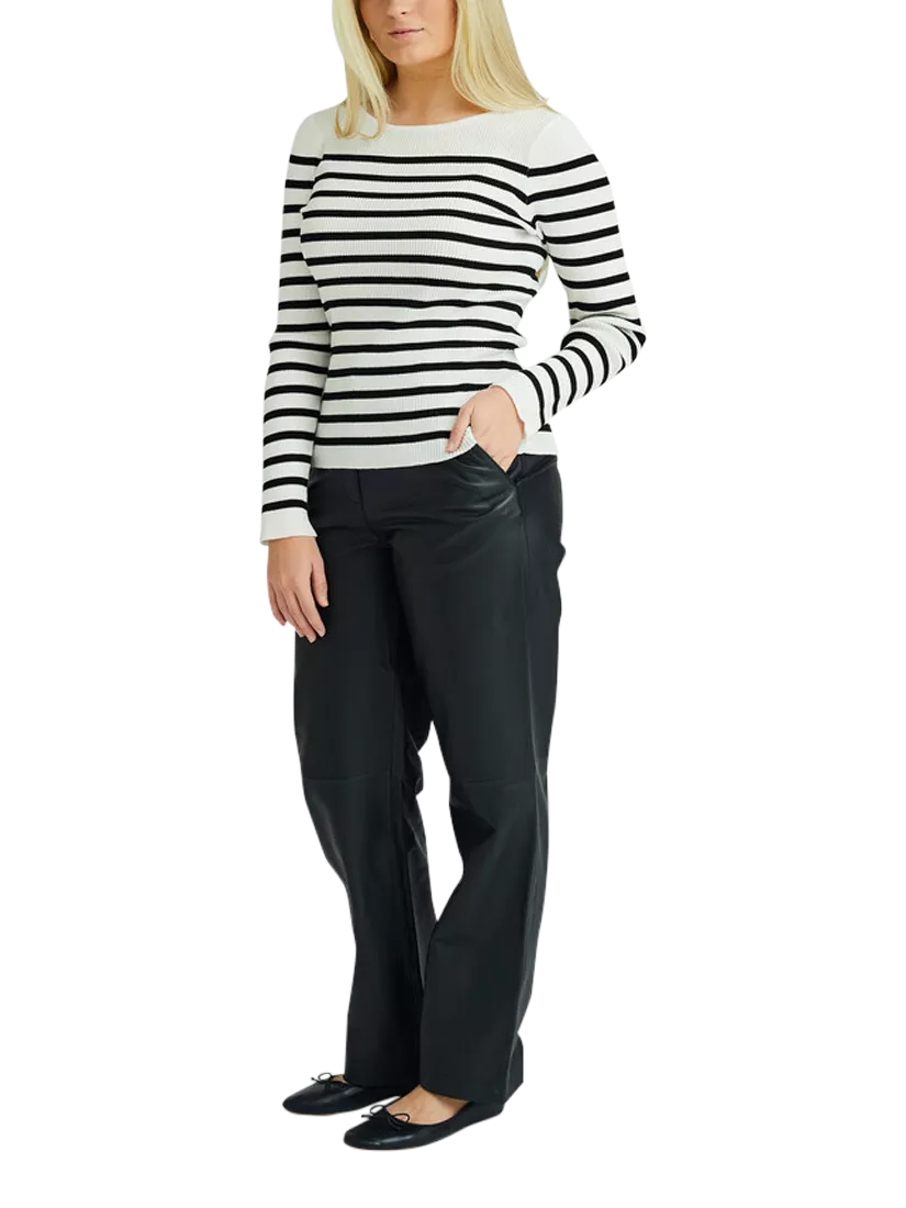 The Rib stripe knit blouse is a ribbed, striped blouse. The blouse features a tight fit, a round neckline, and long sleeves. The blouse fits true to size.