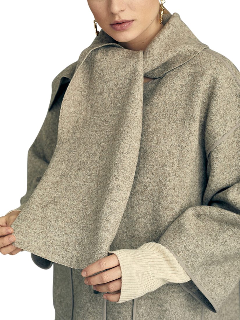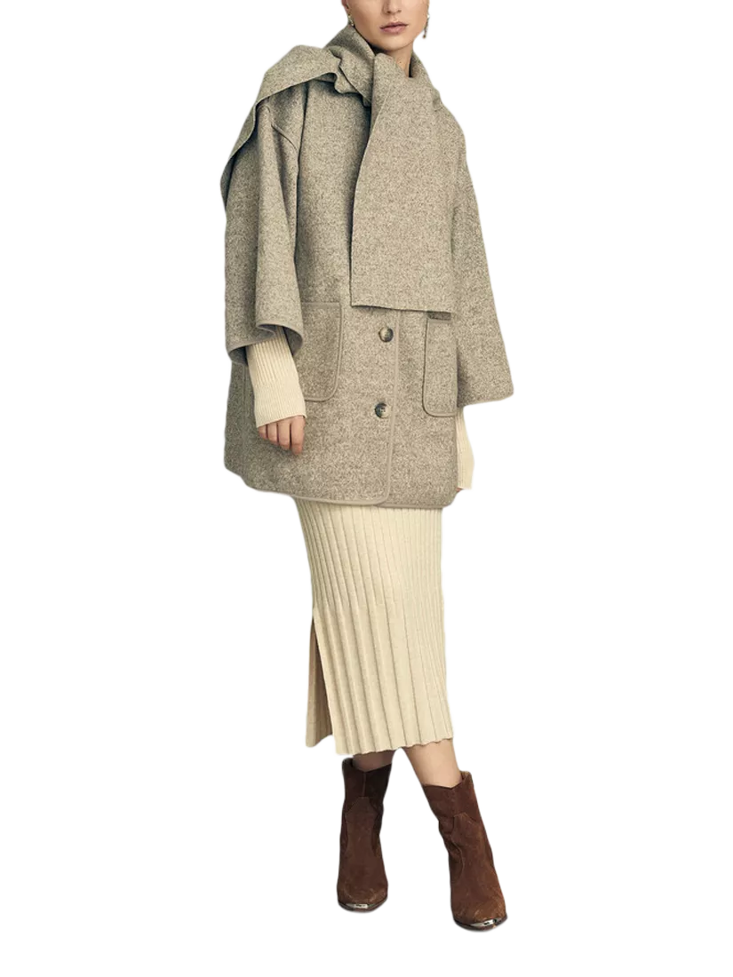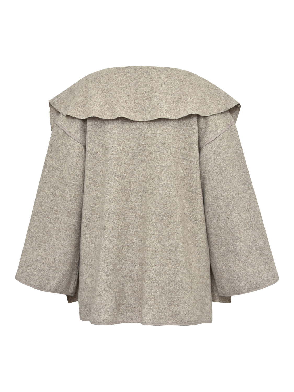 The Sandy jacket is a short jacket with three-quarter sleeves. It closes with buttons at the front and has two pockets. It features an O-neckline and a sewn-in scarf. The jacket fits true to size.