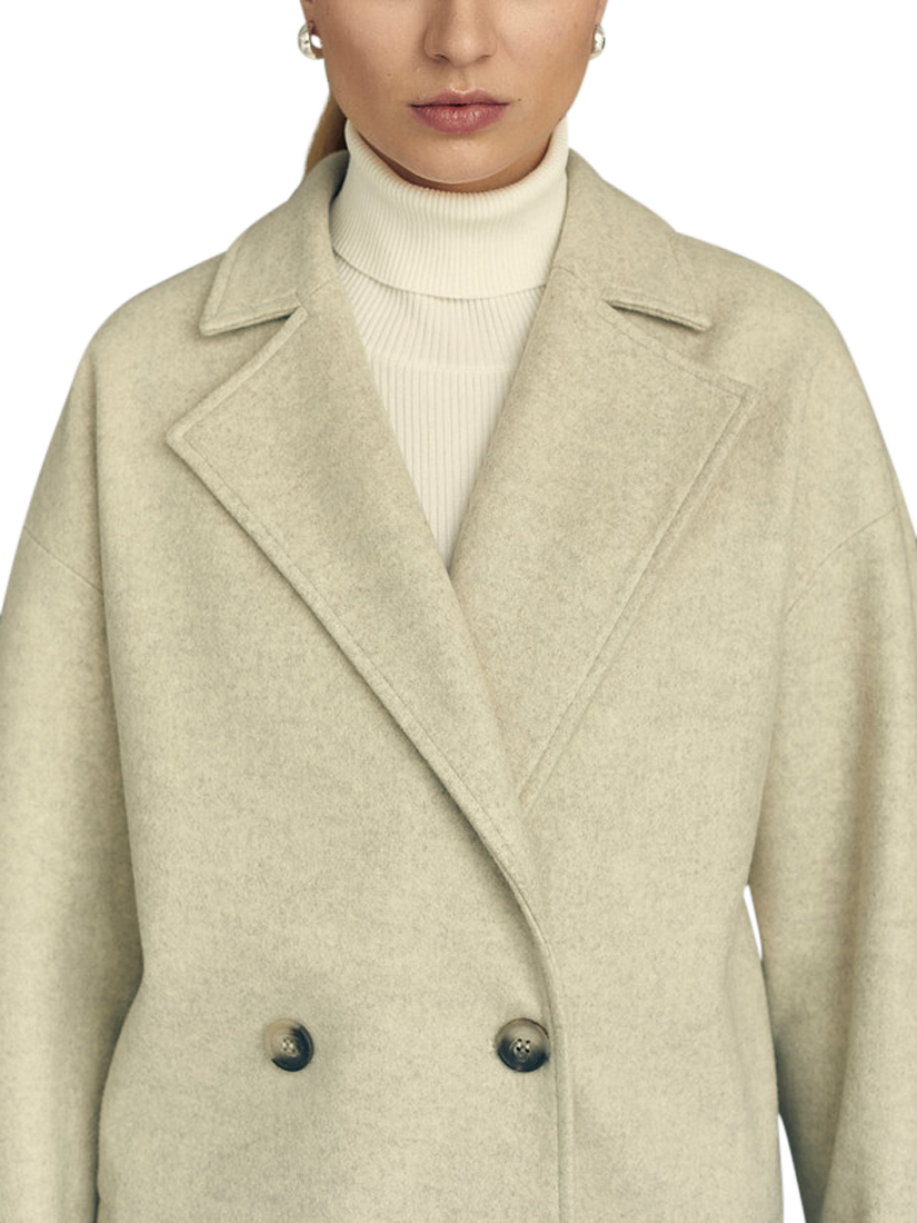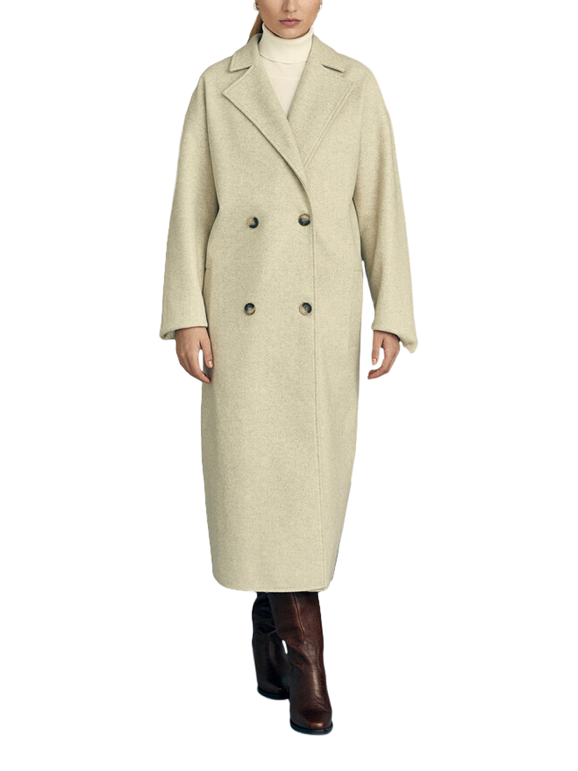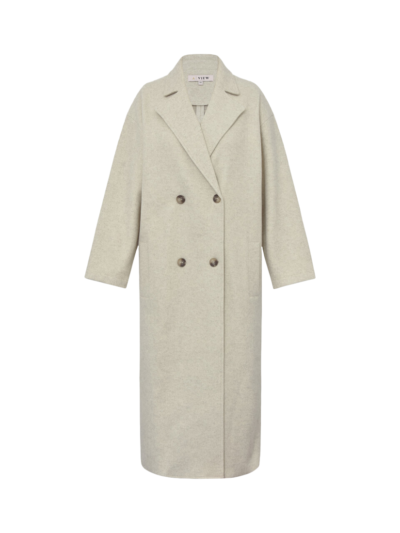 The Shea coat is a long coat with drop shoulder sleeves. The coat features long sleeves, a V-neckline, and closes with two buttons.
