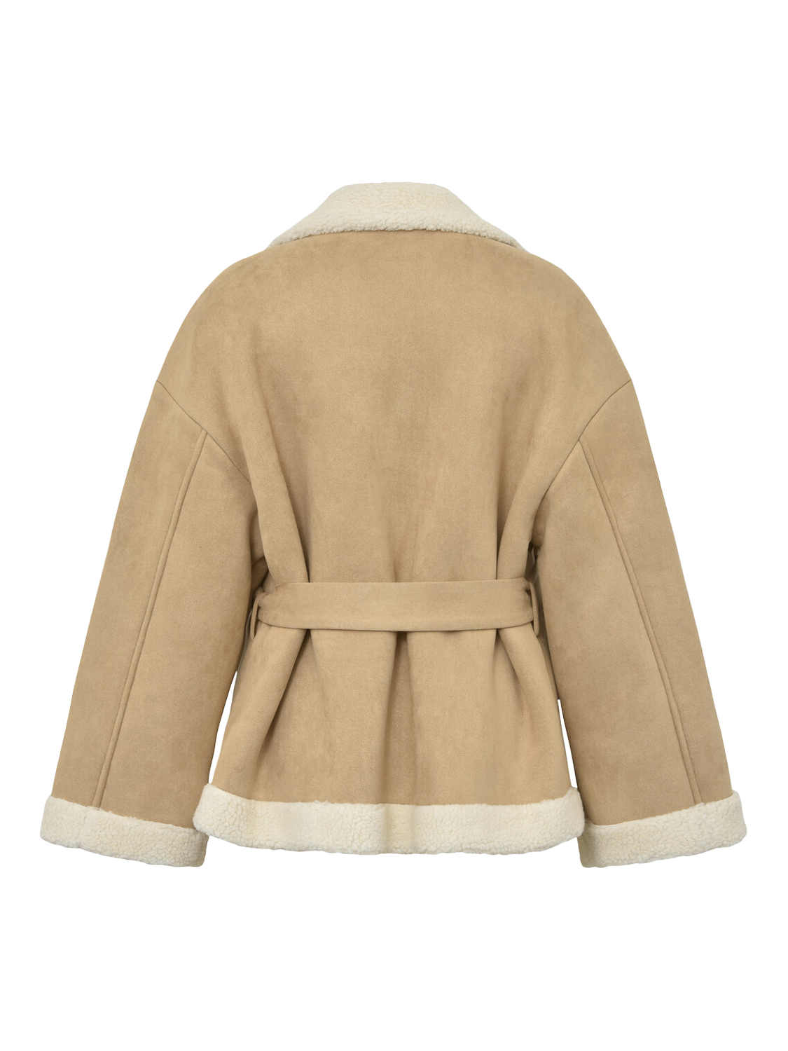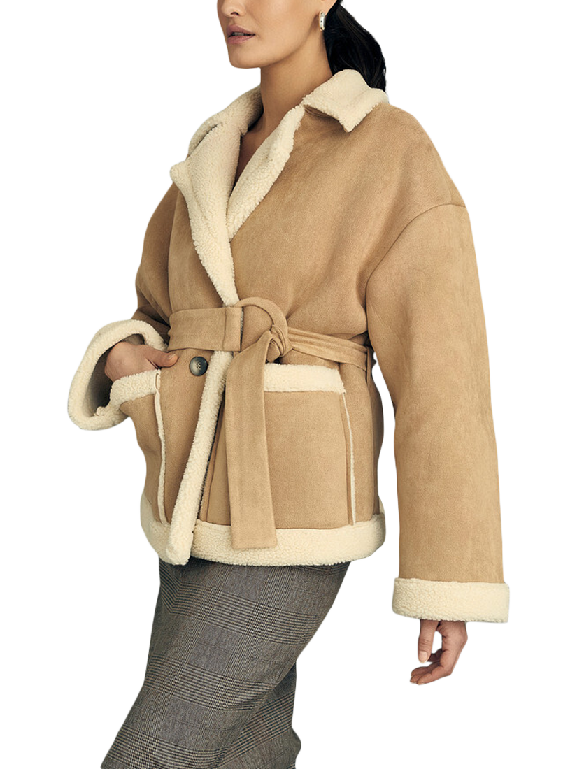 The Ulria short jacket is a short, shearling jacket made of faux leather material. The jacket features a V-neckline, long sleeves, and has a teddy lining. It closes with a button and a belt. The jacket fits true to size.