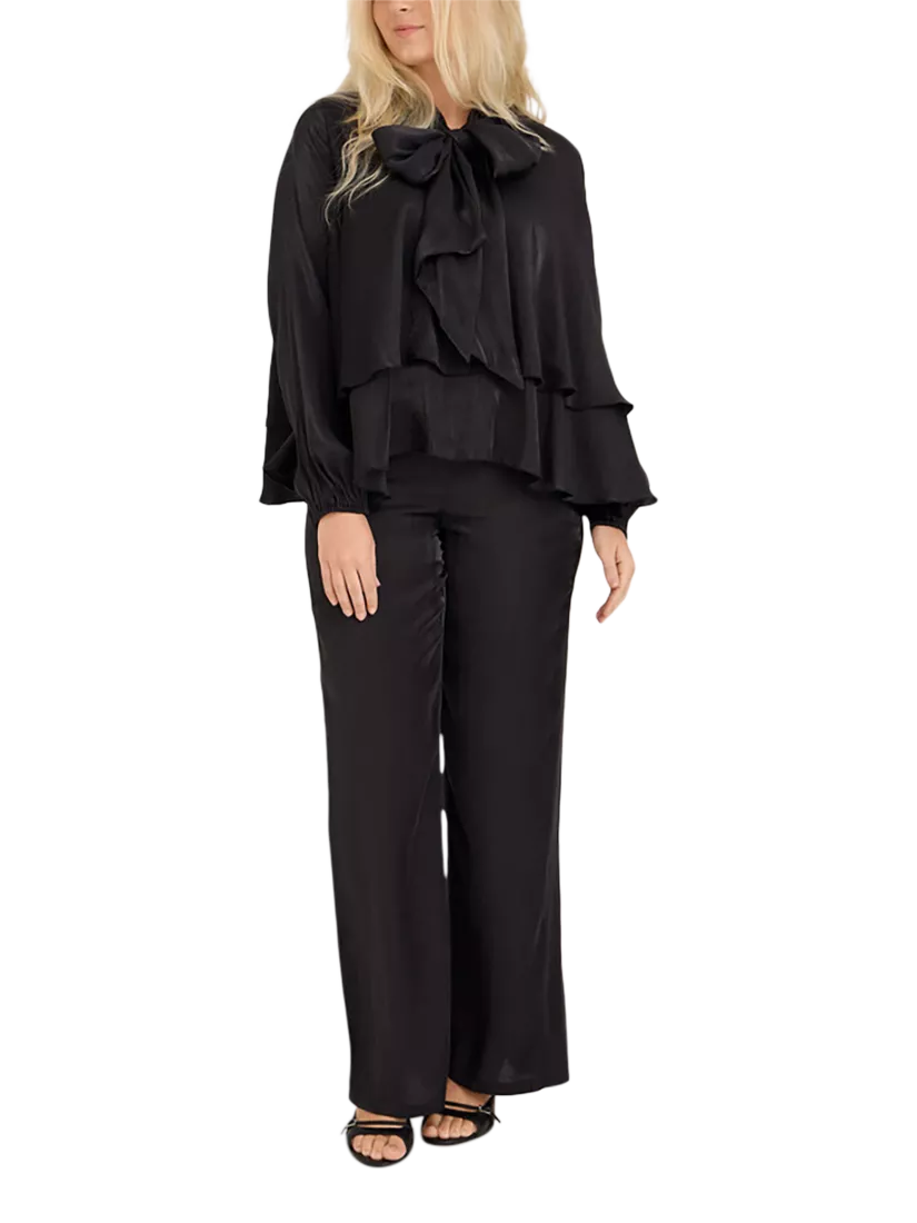 The Vilja blouse is a long sleeve top in a shiny material. The blouse features overlapping layers, a halterneck neckline, and a tie at the neck. The blouse has a loose fit.