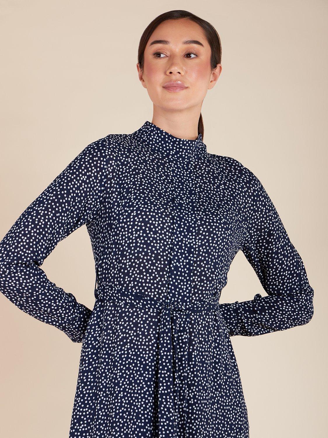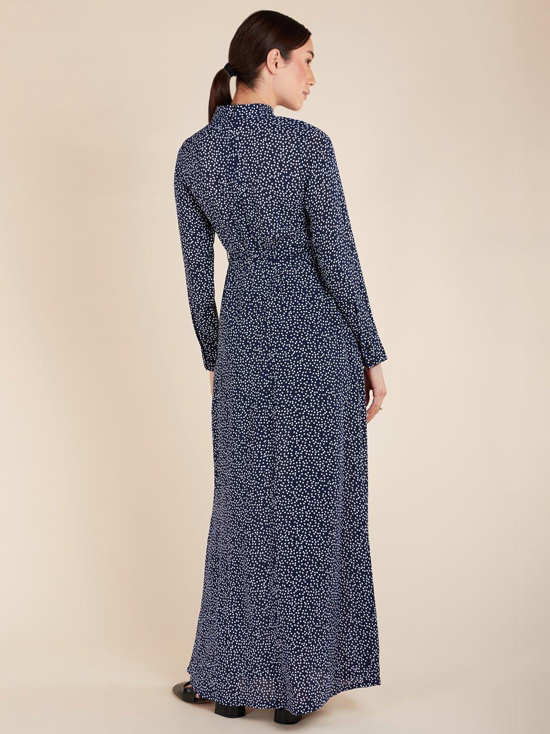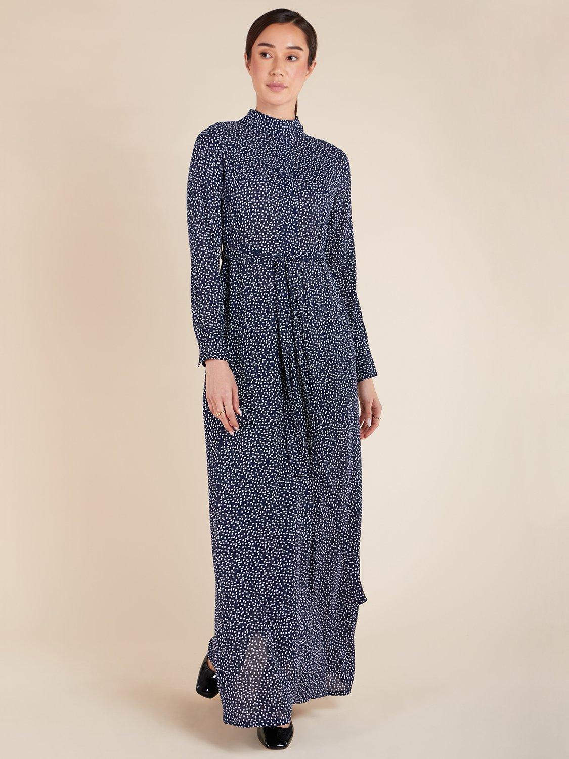 This maxi dress has a turtleneck design and a lively polka dot pattern. It also includes a concealed zip at the back and the option to add a belt. Alternatively, you can pair it with your own belt for a more personalised look. The dress features a fluid A-line silhouette and discreet side pockets.
