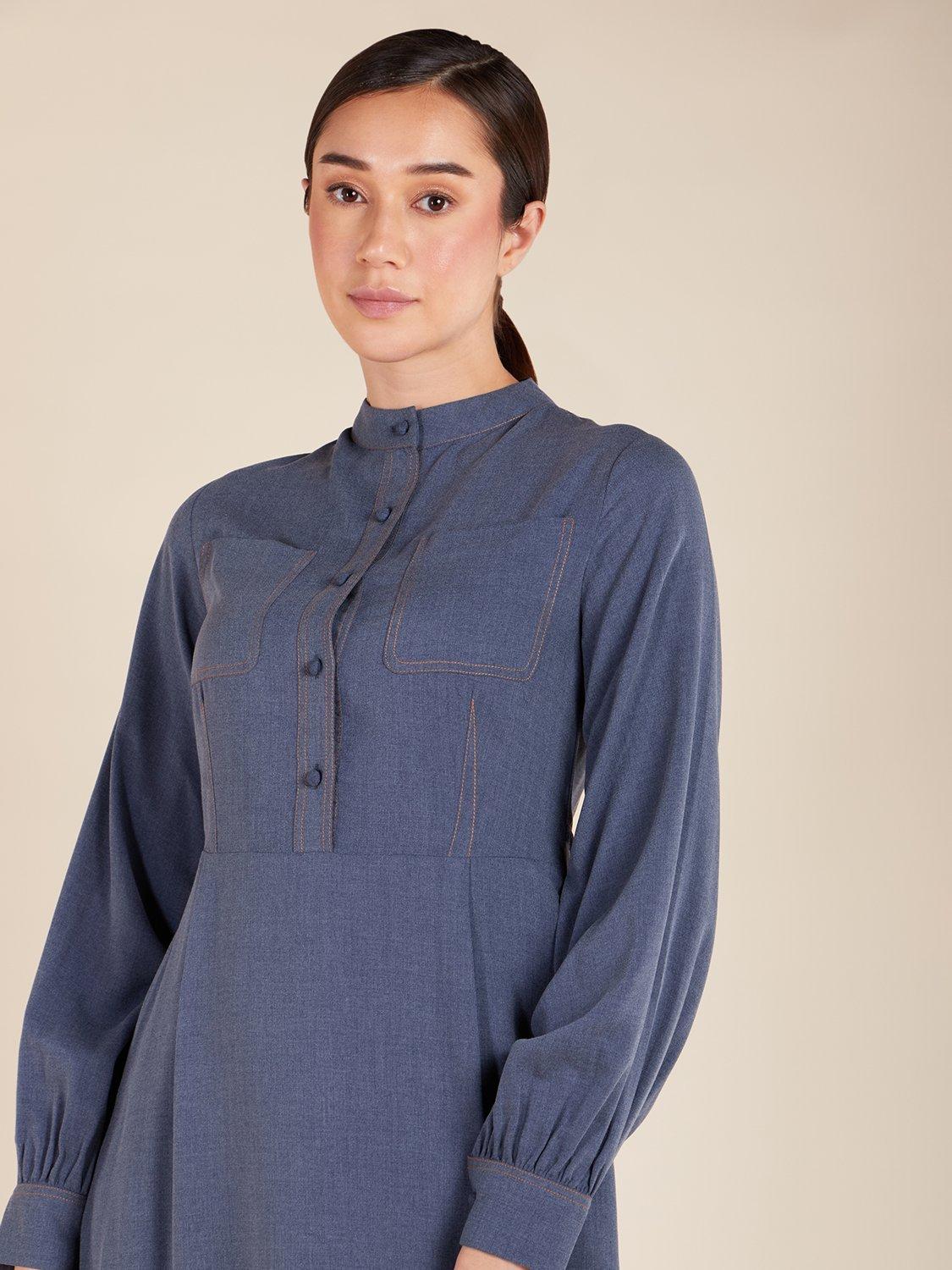 Made from comfortable denim-like fabric, the Classic Shirt Maxi has a striking denim appearance with its rustic orange stitching on the bodice. This sophisticated piece also has a mandarin neckline, self-fabric buttons, and a detachable belt, providing a polished finishing touch. With side slits, the design offers a relaxed and fluid silhouette.