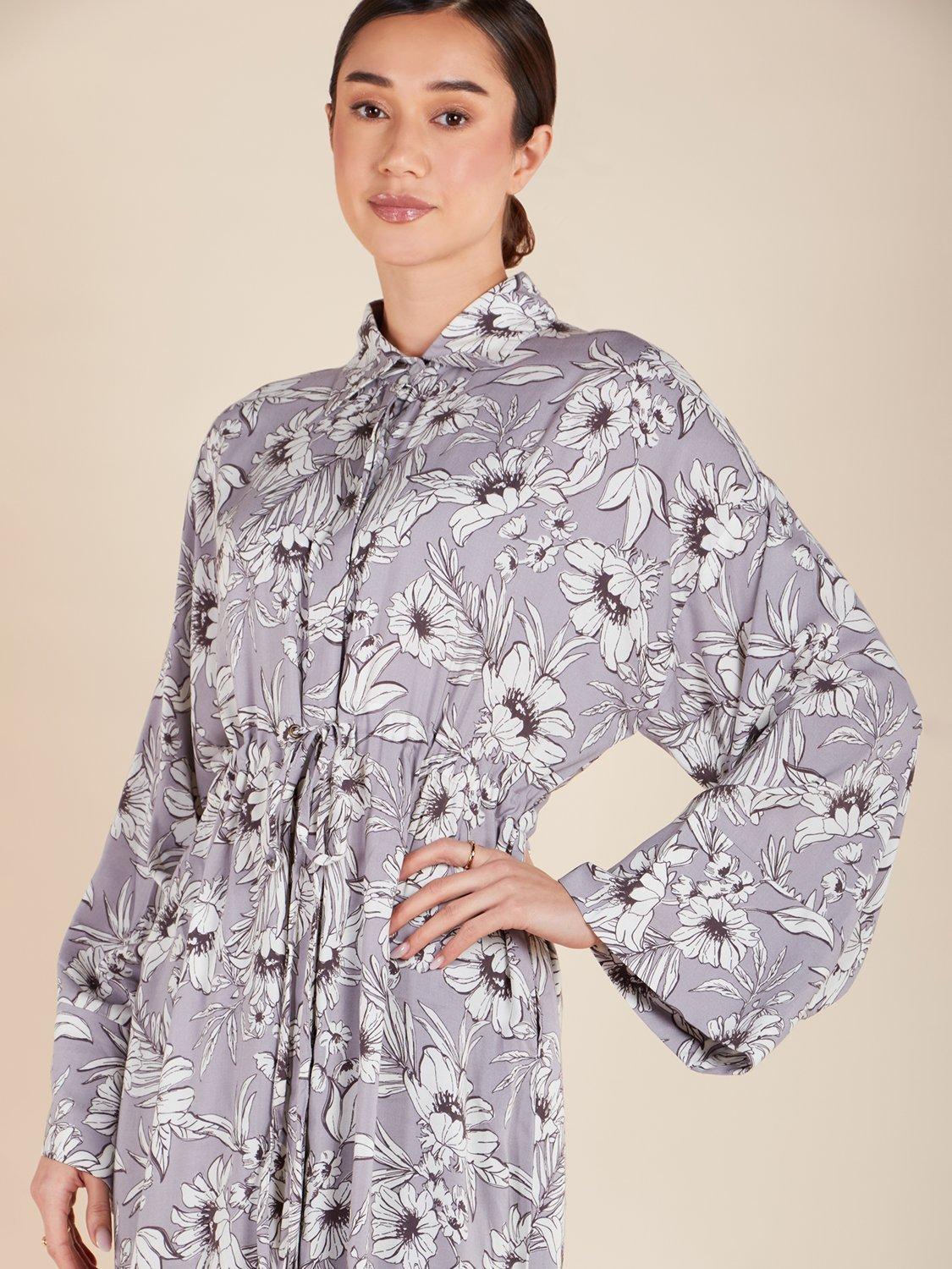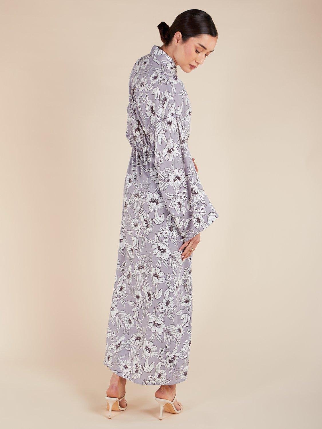 A bold floral print contrasts against a mauve tone in the Dahlia Maxi Dress, featuring a straight cut with loose upper body and sleeves. The built-in drawcord allows you to define your waist, while a button opening and wide sleeves add a touch of elegance.
