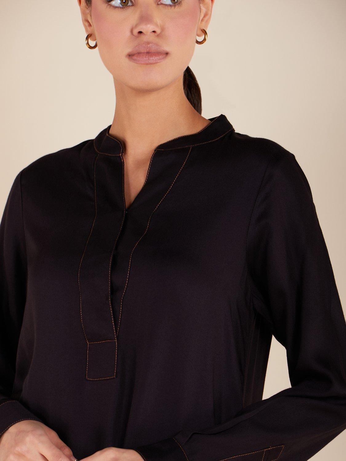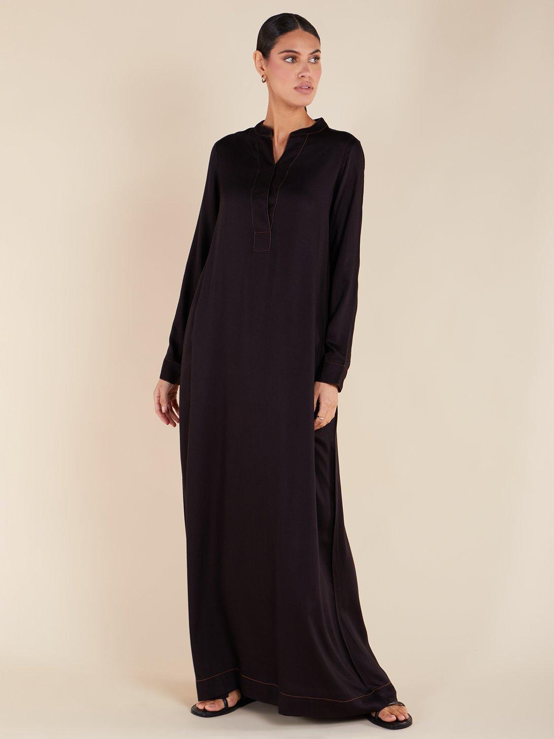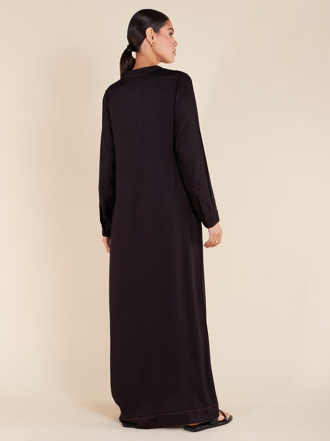 This Casual Maxi is crafted from a smooth black twill fabric with a relaxed fit. The neckline, base, and cuffs feature a single orange stitch for a rustic touch, resembling denim. Additionally, it includes discreet side pockets for practicality.