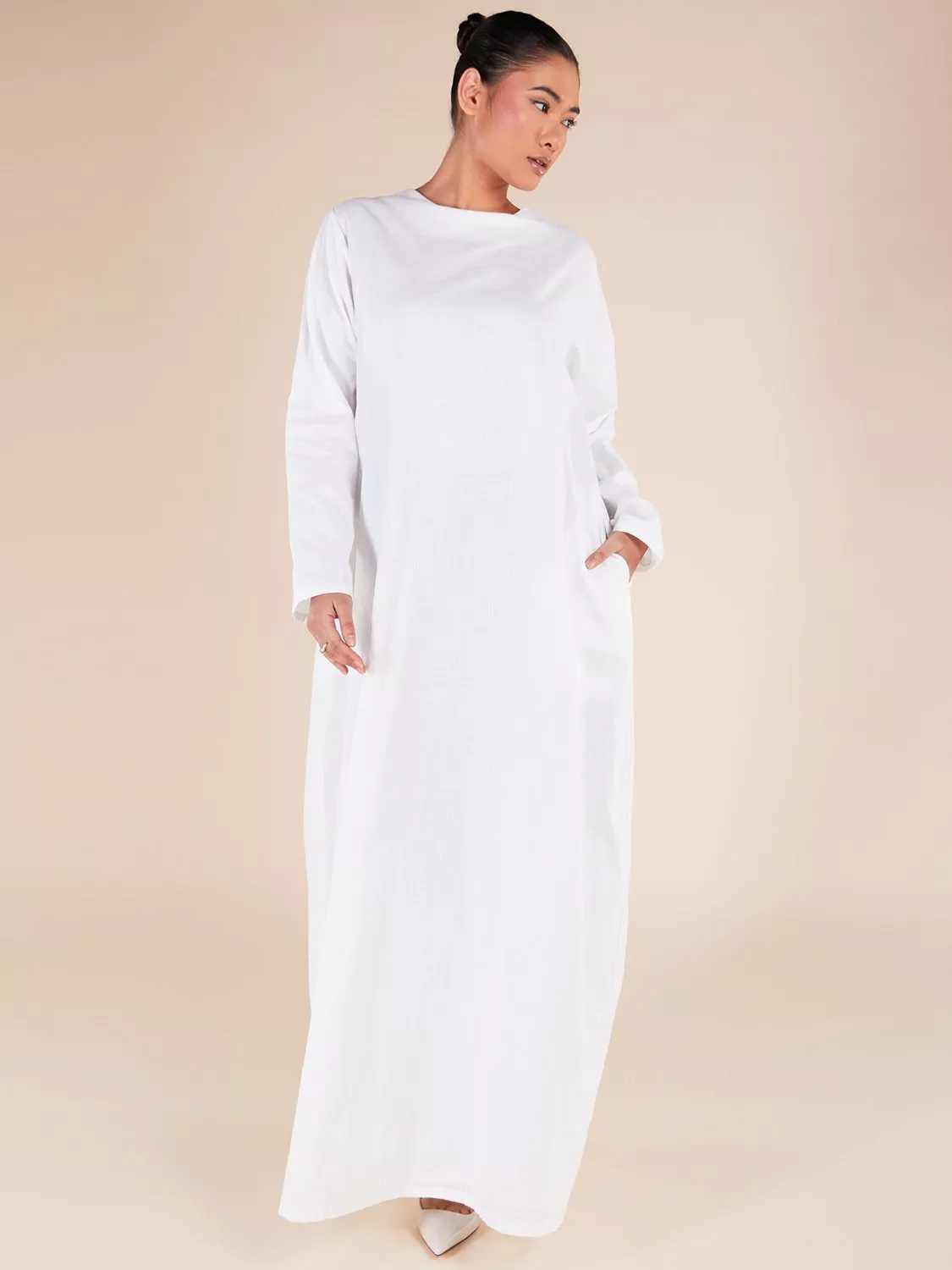 Ideal for pairing with open Maxis and kimonos, this fully lined slip dress is a must-have addition to your wardrobe, and has a linen look that exudes elegance.