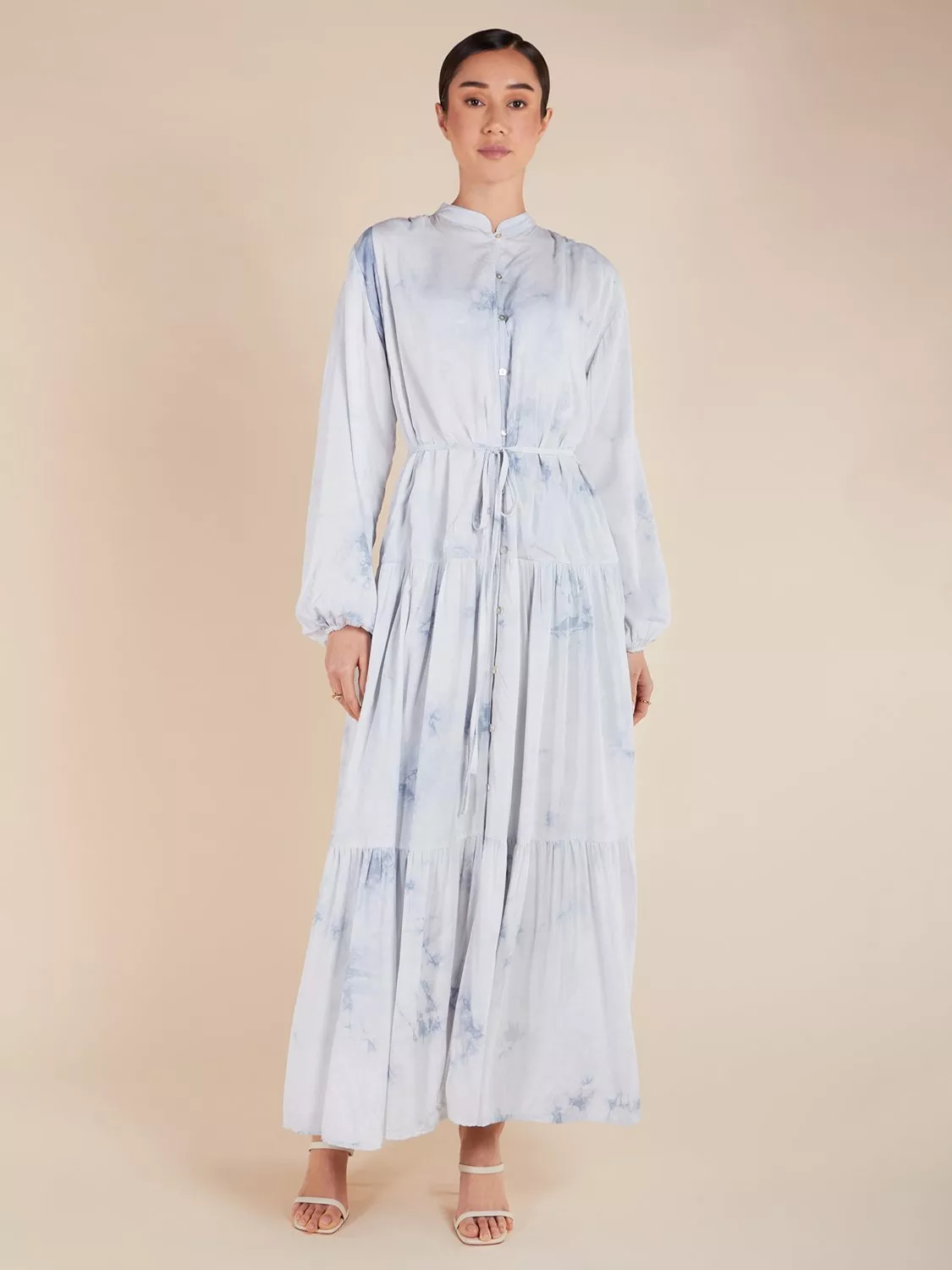 This lightweight, airy maxi dress is made from soft cotton with a subtle yet elegant marbling effect. It features natural shell buttons and a slim self-fabric belt, allowing for a cinched waist or a free-spirited look. The dress is fully lined for comfort and ease of wear.