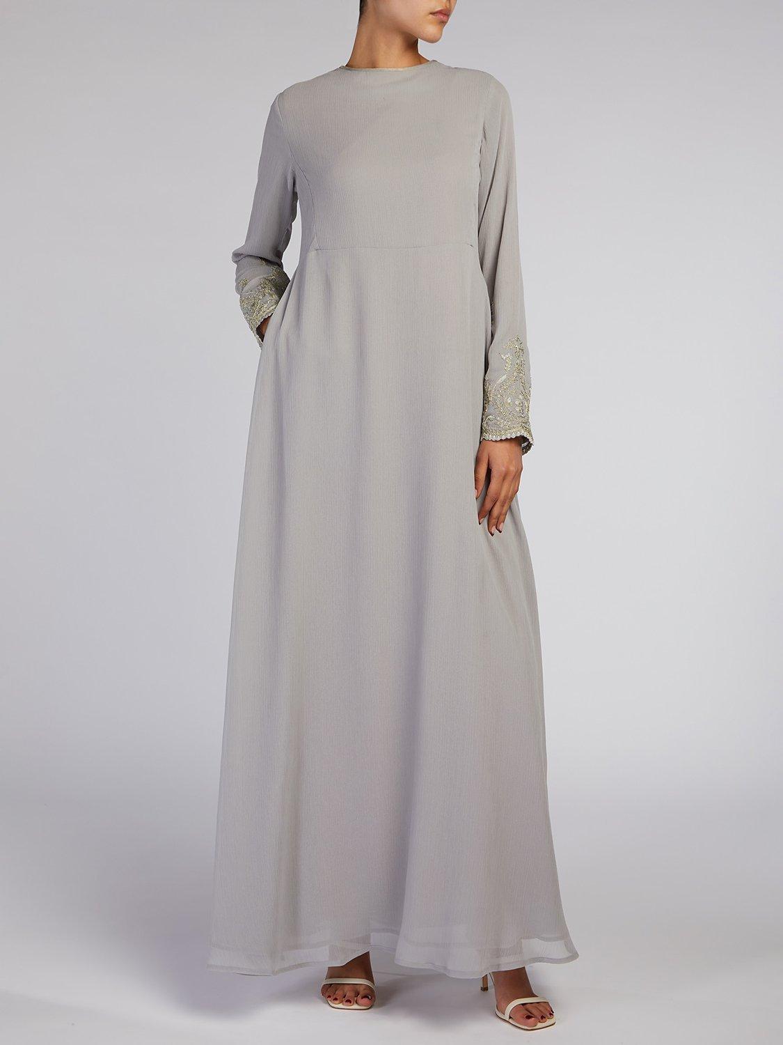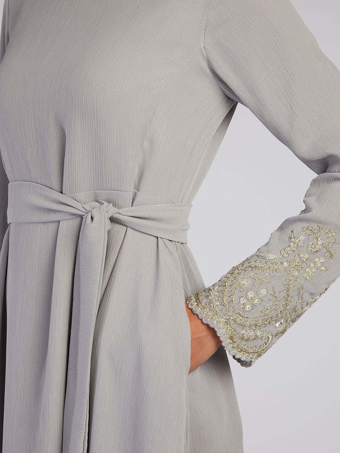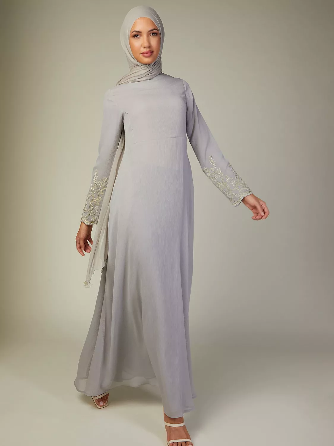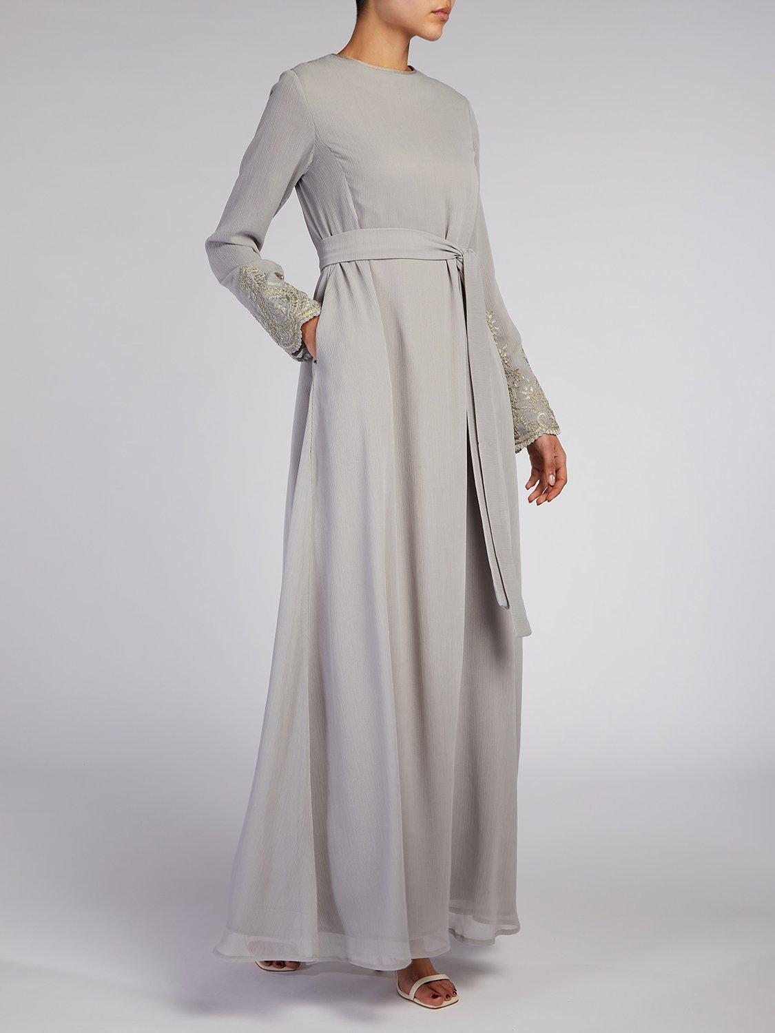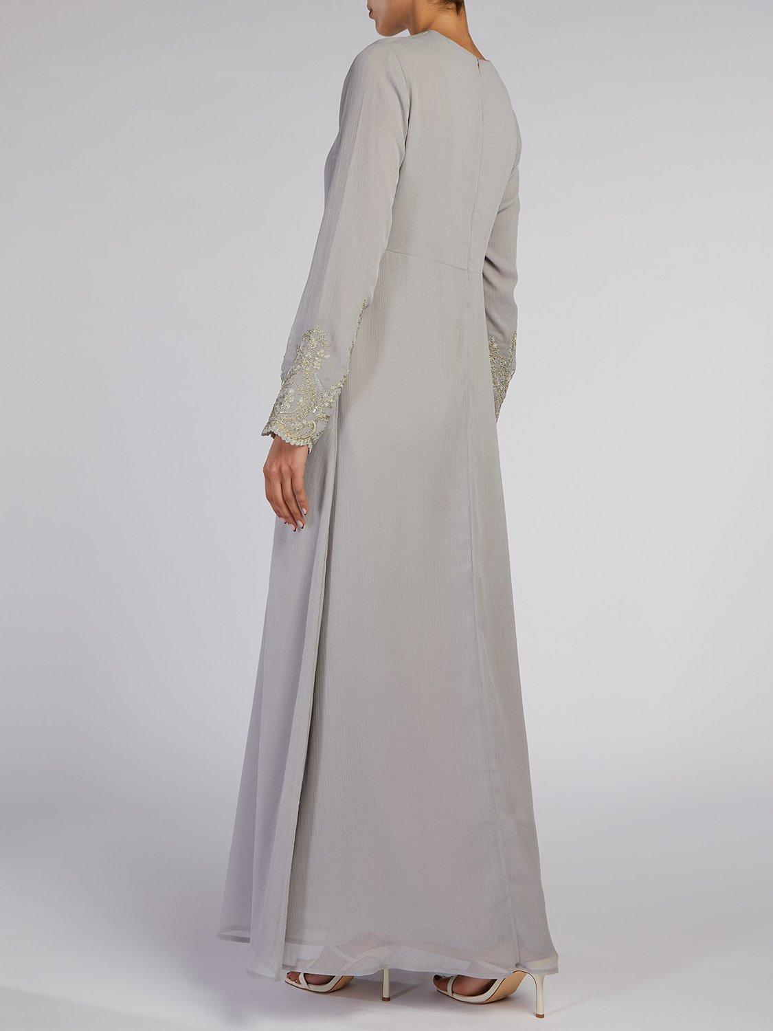 Inspired by Miniature Art by the famous artist Behzad, this beautiful Maxi features detailed and intricate embroidery mimicking the beautiful landscapes he portrayed in his paintings. The embroidery features heavily on the sleeve cuffs making it a stunning showstopper. The Maxi can be worn with or without the detachable belt with a zip fastening at the back for ease of wearing.
