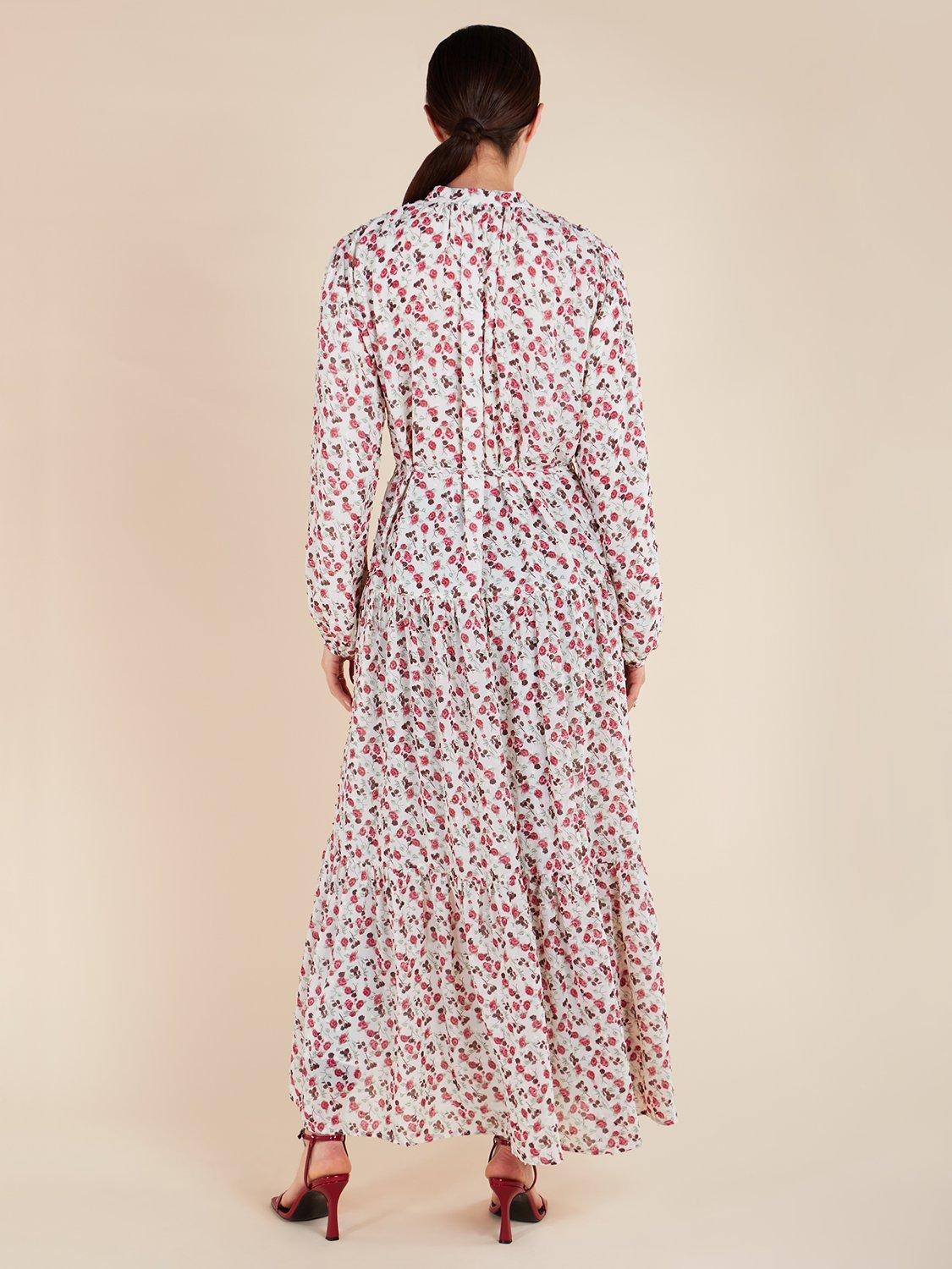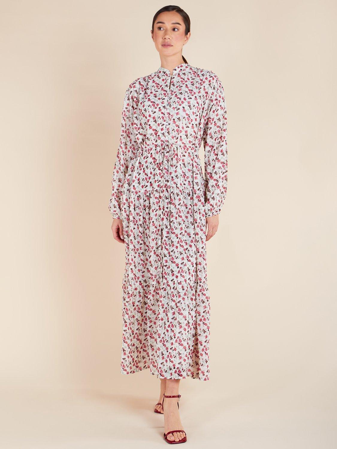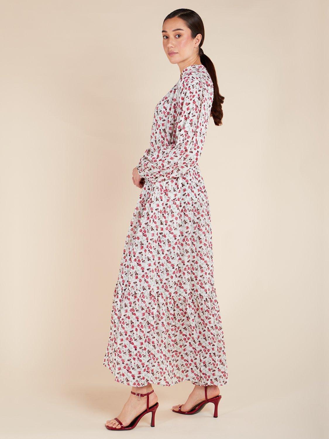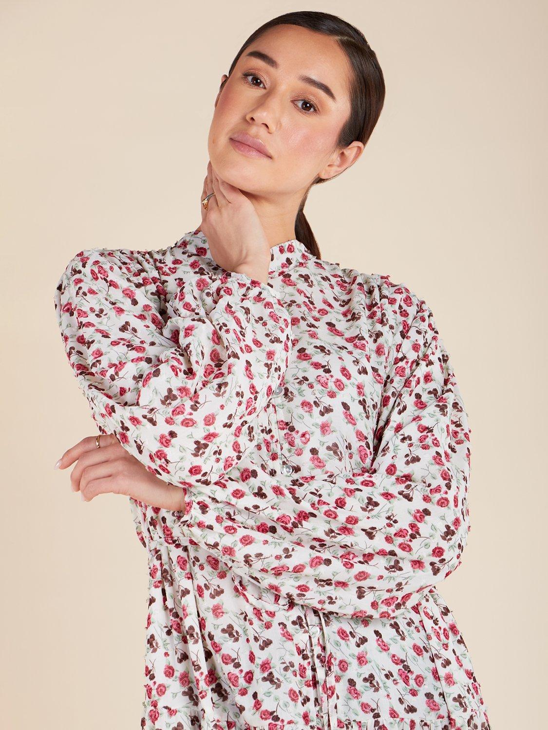 This Pamposh Maxi has a fully lined, tiered design in beautiful shades with a floral semi-textured print. Complete with a classic mandarin neckline, shell buttons, and discreet side pockets, it also offers the option to add a belt for a more tailored fit.