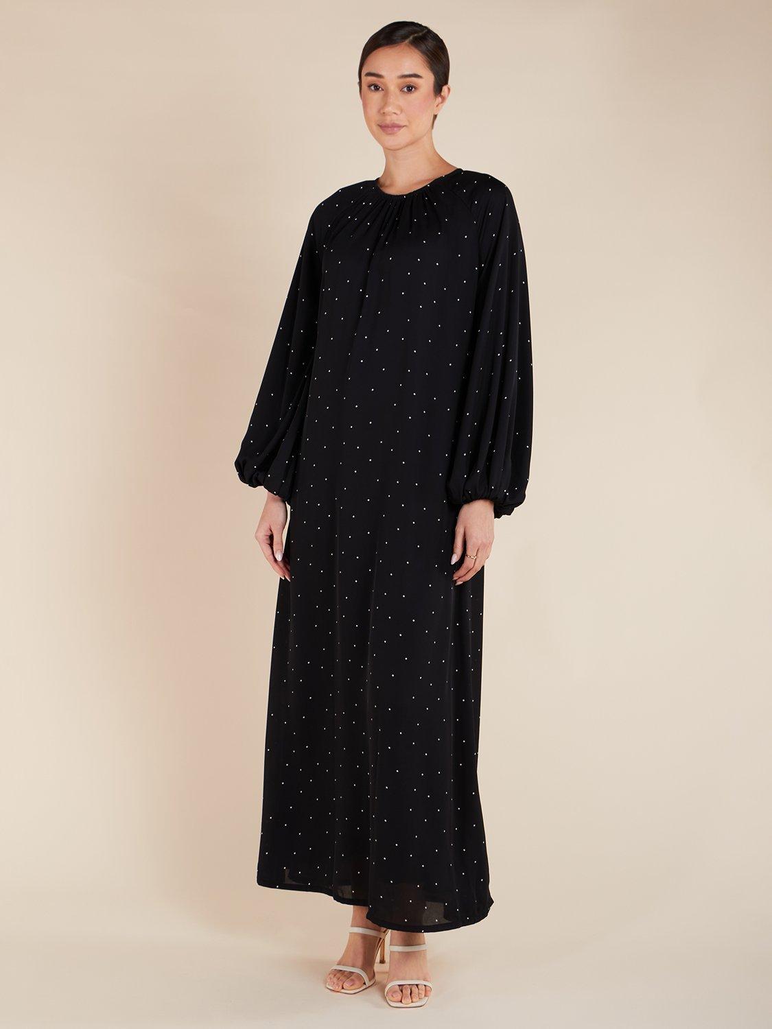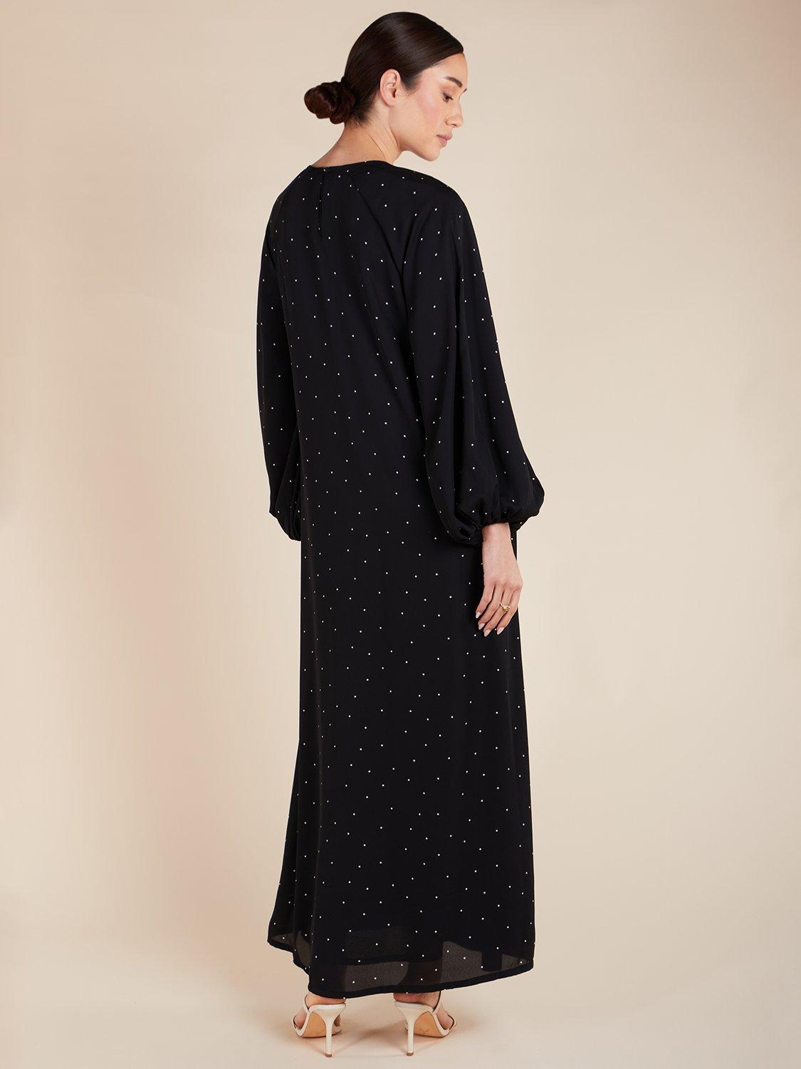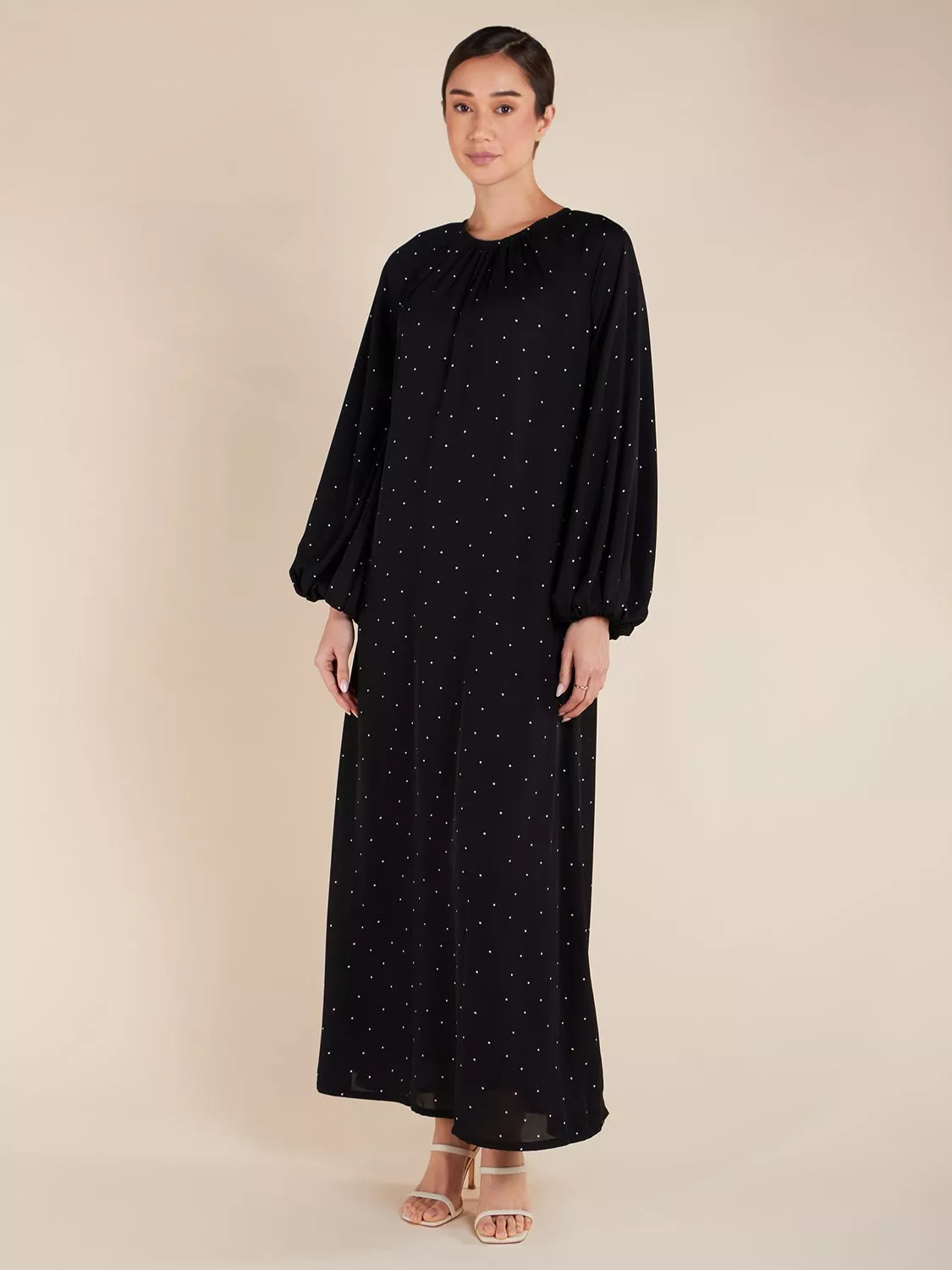 This maxi dress has a relaxed, fluid appearance, with balloon-style sleeves and subtle pleats on the neckline. The back features a discreet button opening, and the dress is made from a soft fabric for ultimate comfort.
