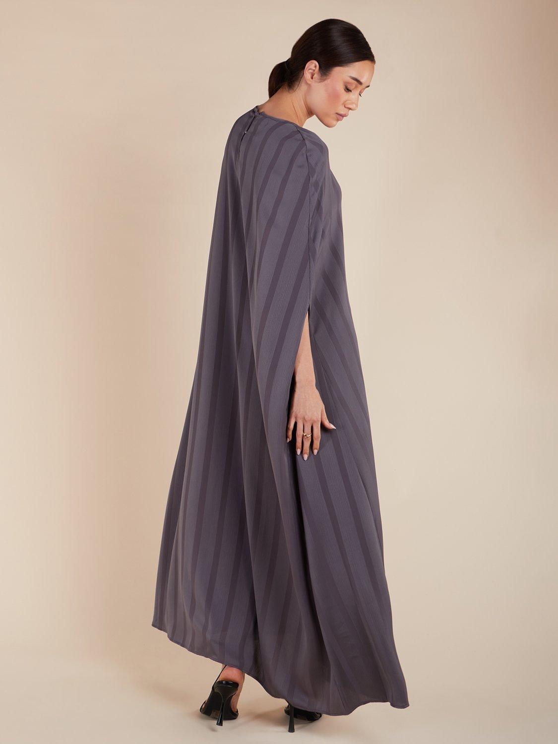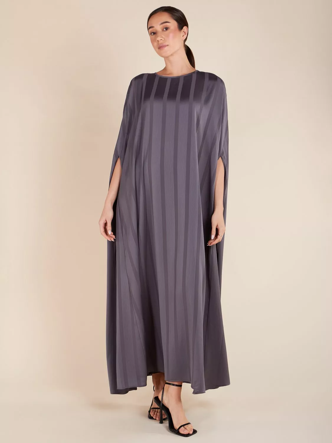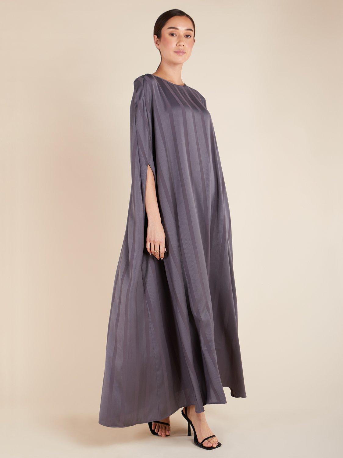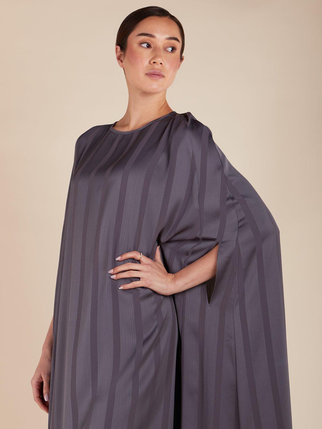The Kaftan is designed with an elegant cut that flatters all body shapes. It features a self-stripe print and is made with a lightweight, flowy fabric. The overall modest cut and fit are perfect for any occasion.
