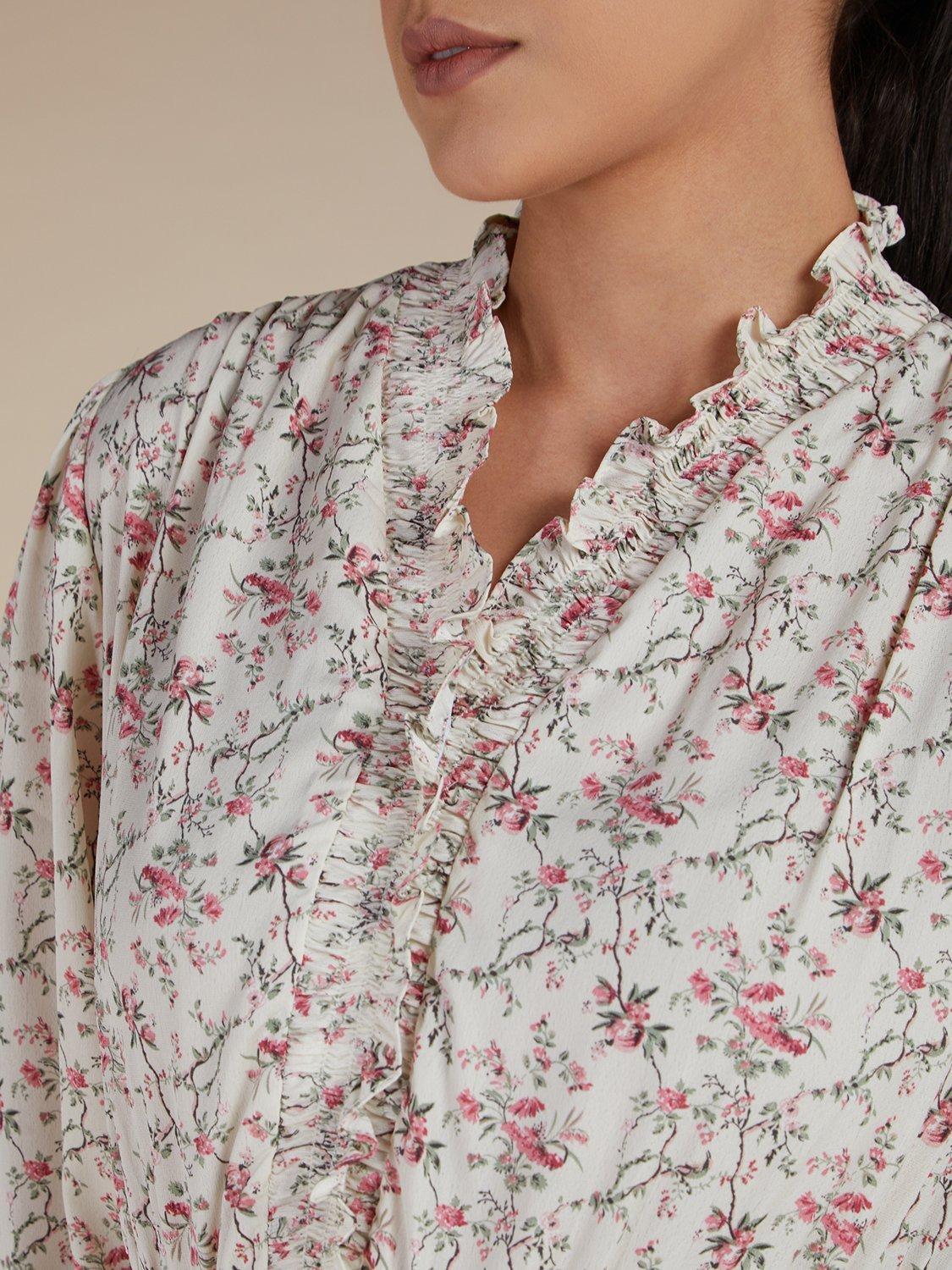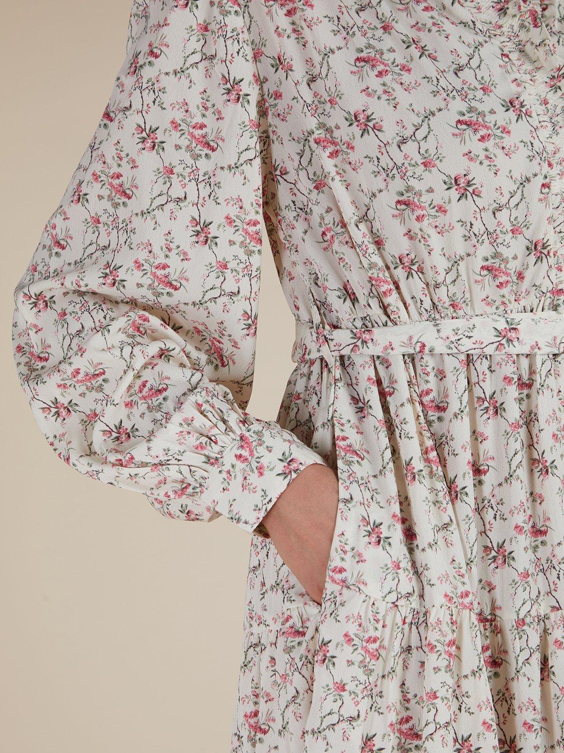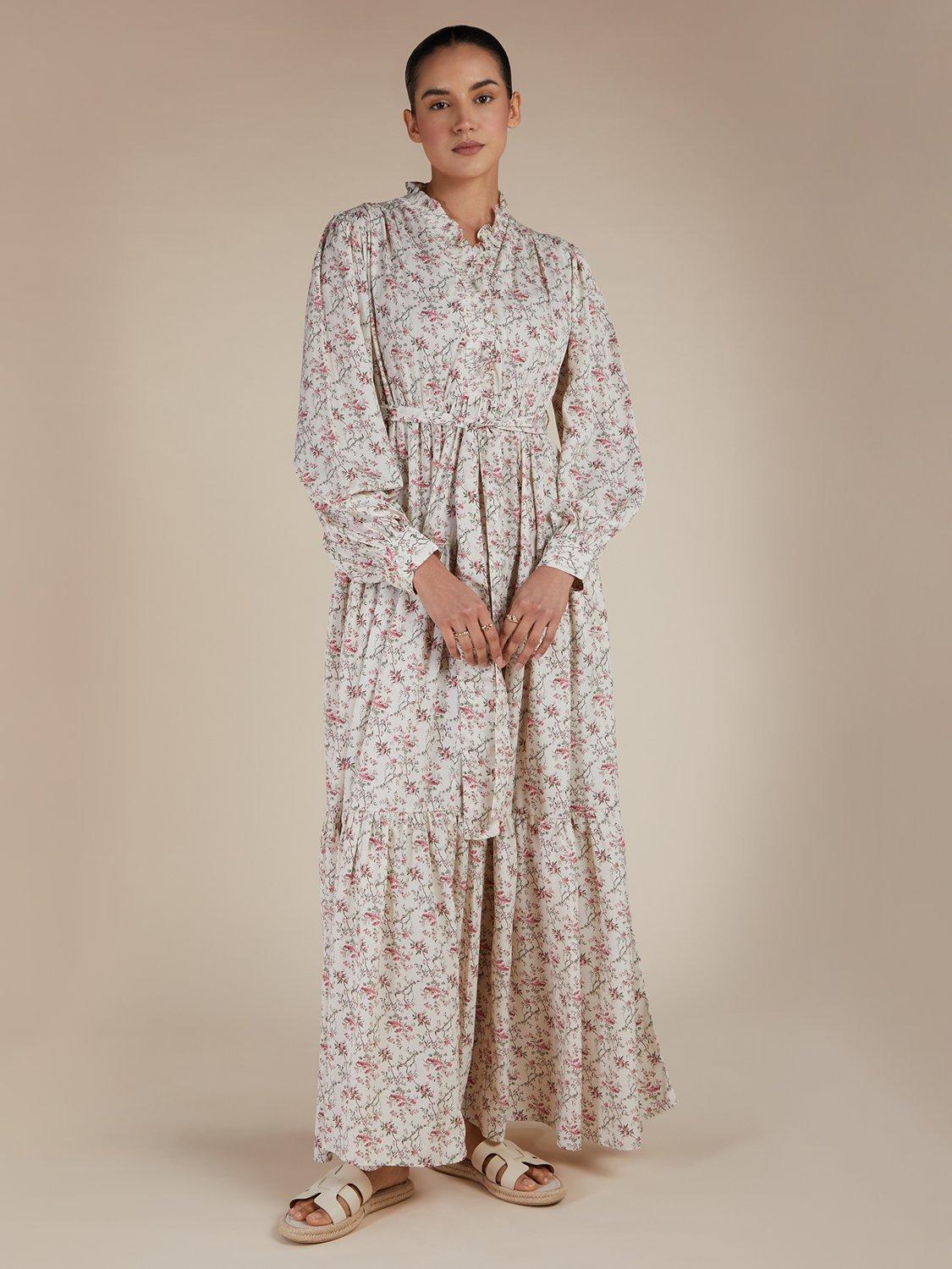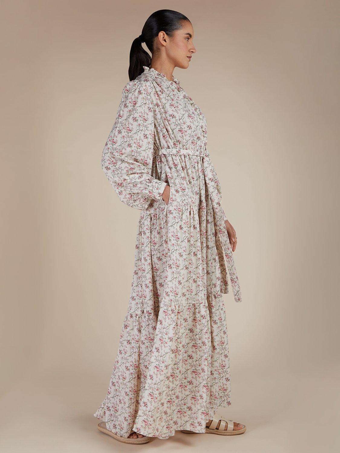 This soft, floaty, floral maxi has a delicate floral print on a neutral, creamy base. Fully lined and designed with feminine tiers and ruffles, the maxi can be cinched at the waist with the self-fabric belt or paired with your own belt for a versatile look. Its loose cut silhouette accommodates the tiers.