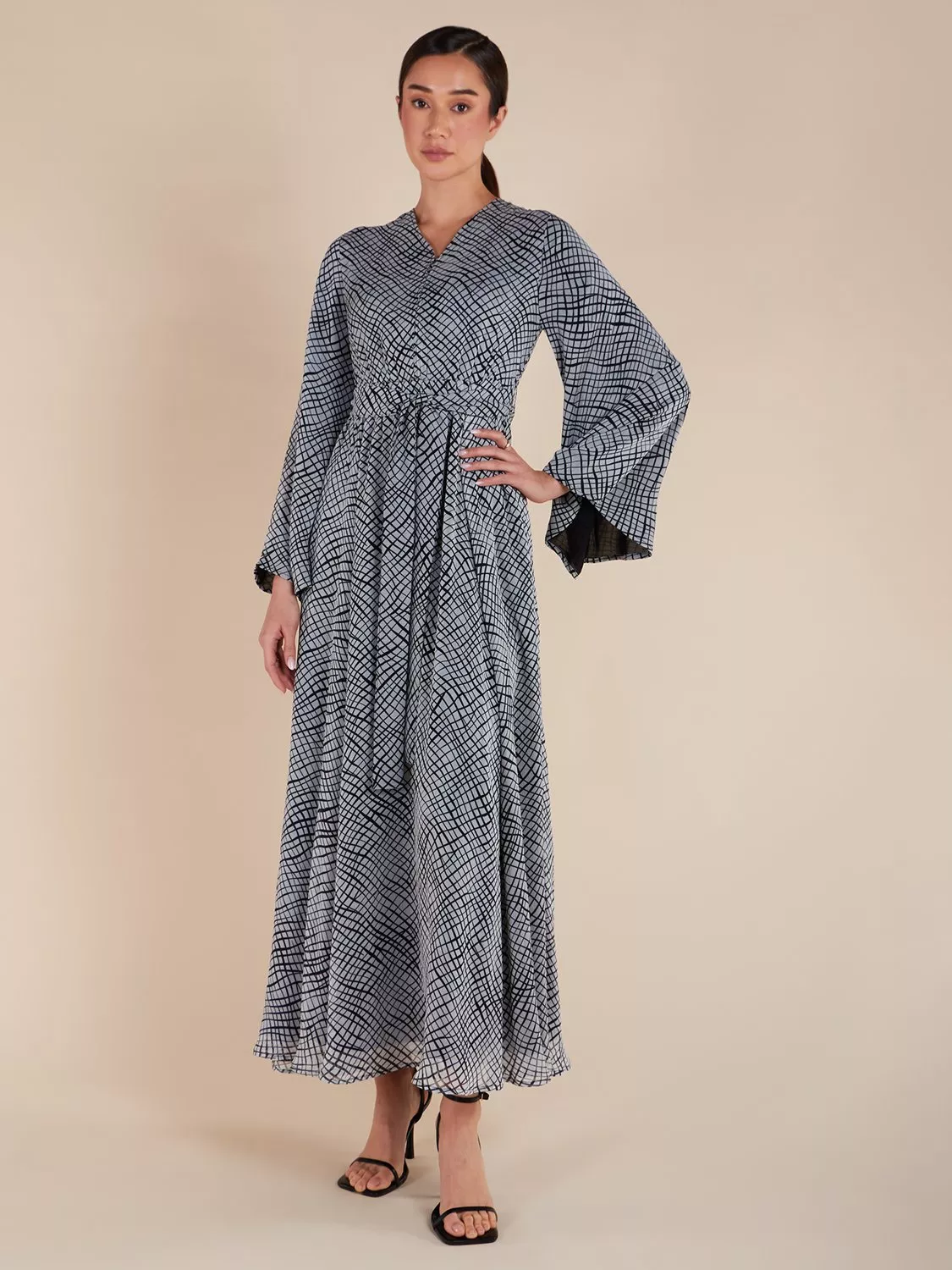 This Shoji Maxi Dress has a monochrome theme and features a v-neckline, flared sleeves, and pleats along the waist. It is fully lined and flowy, with discreet side pockets for convenience. Our wide sleeve design includes a button in the inner sleeve to prevent the sleeves from rising up and exposing the arms.