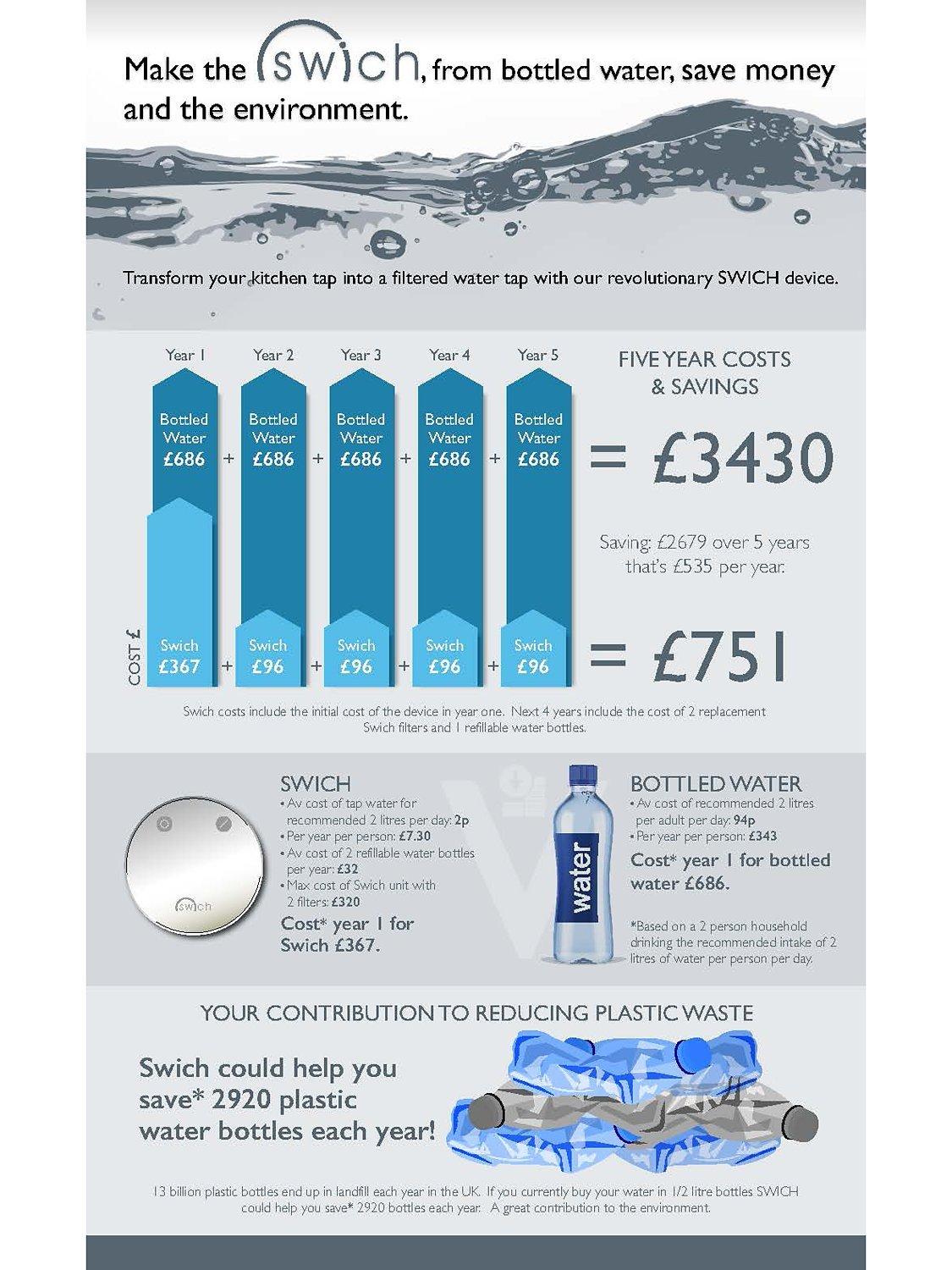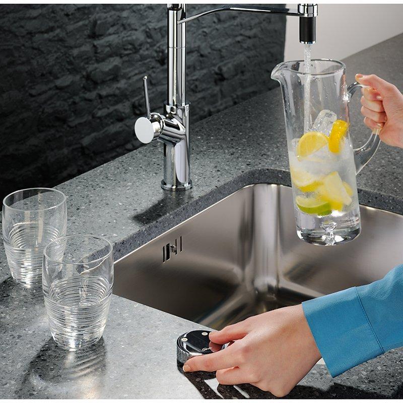 Choose the domestic supply for washing up and the filtered supply for better-tasting water. Normal domestic water passing over the activated carbon filter reduces chlorine levels and reduces sediment, dirt, dissolved metals and rust, resulting in a substantially improved water taste. It saves you shopping time and money by not having to buy water in plastic bottles, making it kinder to the environment too. A Swich refill cartridge is included and has a lifespan of 6 to 12 months.