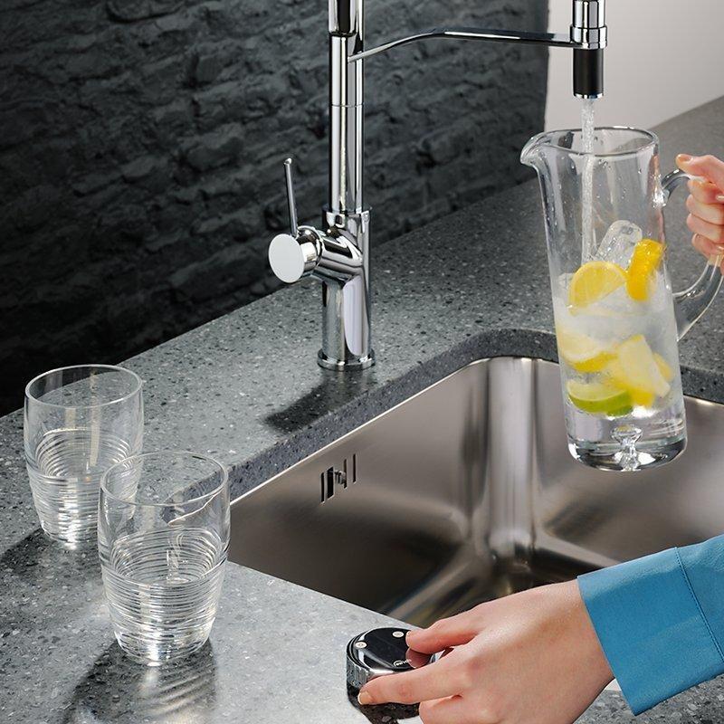 Choose the domestic supply for washing up and the filtered supply for better-tasting water. Normal domestic water passing over the activated carbon filter reduces chlorine levels and reduces sediment, dirt, dissolved metals and rust, resulting in a substantially improved water taste. It saves you shopping time and money by not having to buy water in plastic bottles, making it kinder to the environment too. A Swich refill cartridge is included and has a lifespan of 6 to 12 months.
