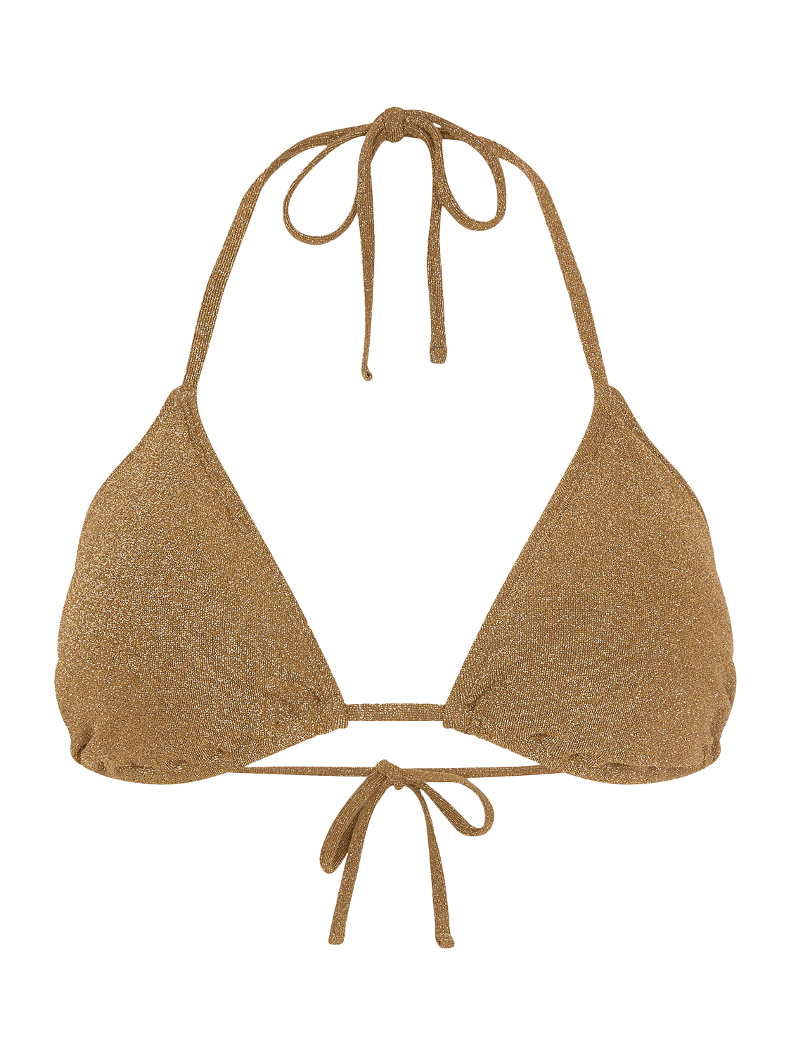 A statement piece for pool parties and boat trips, this bikini top will shine under the summer sun. Designed with metallic fabric, it's cut in triangle cups with adjustable ties on the neck and back.